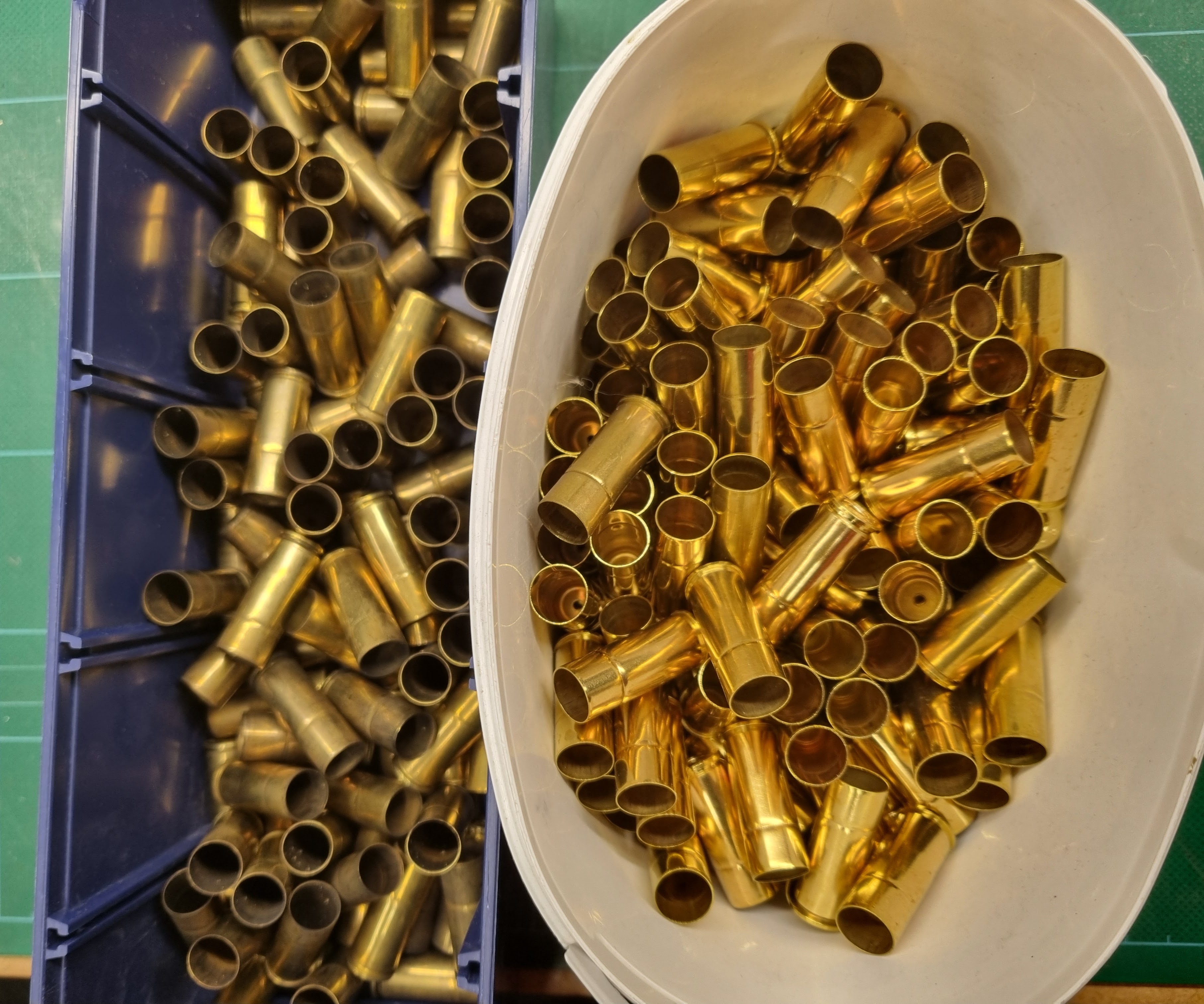 Alla engångsskjutna, mest Magtech, c:a 150 tvättade och utan tändhatt, som nya Finns i södra Halland. 800:-