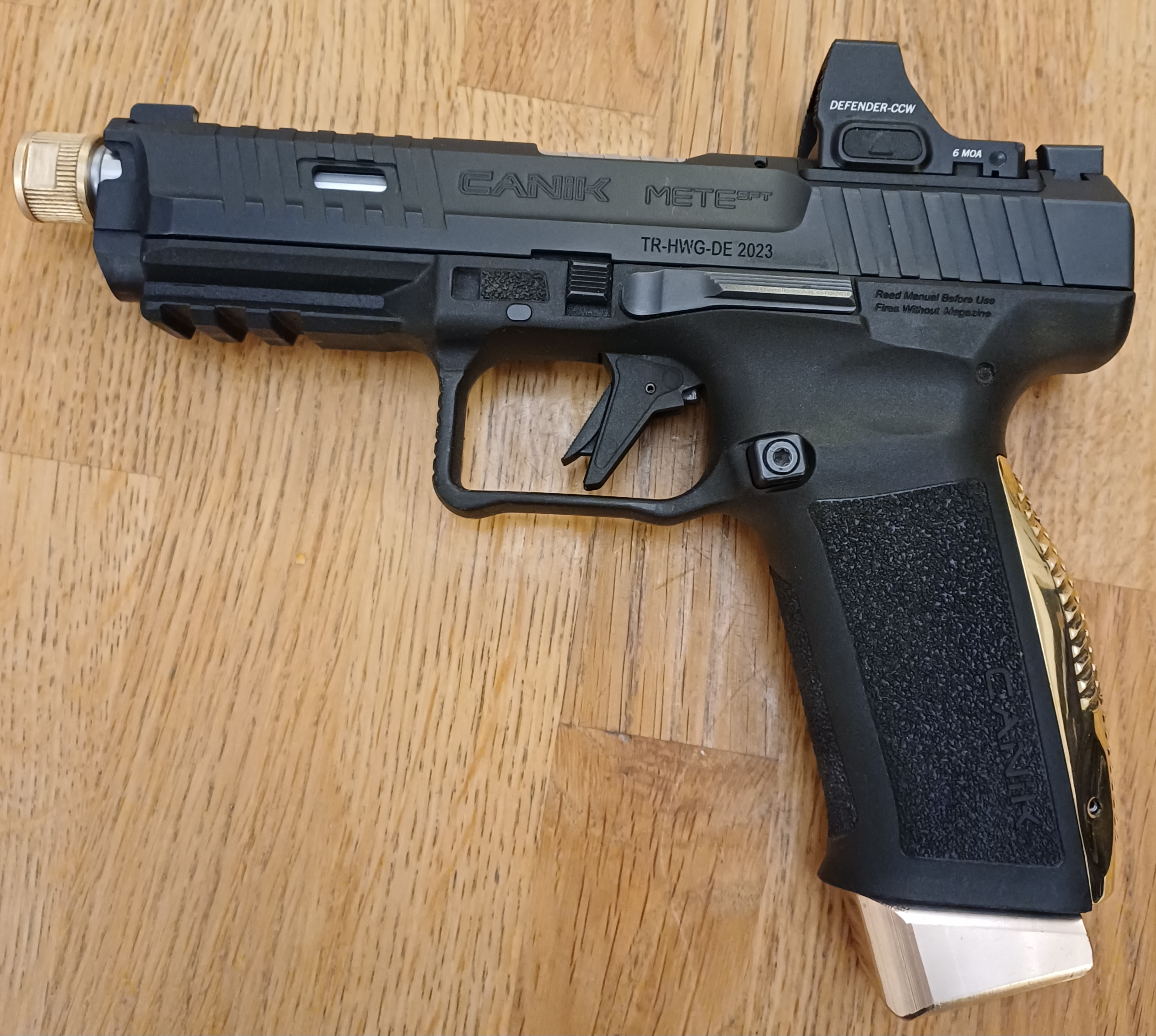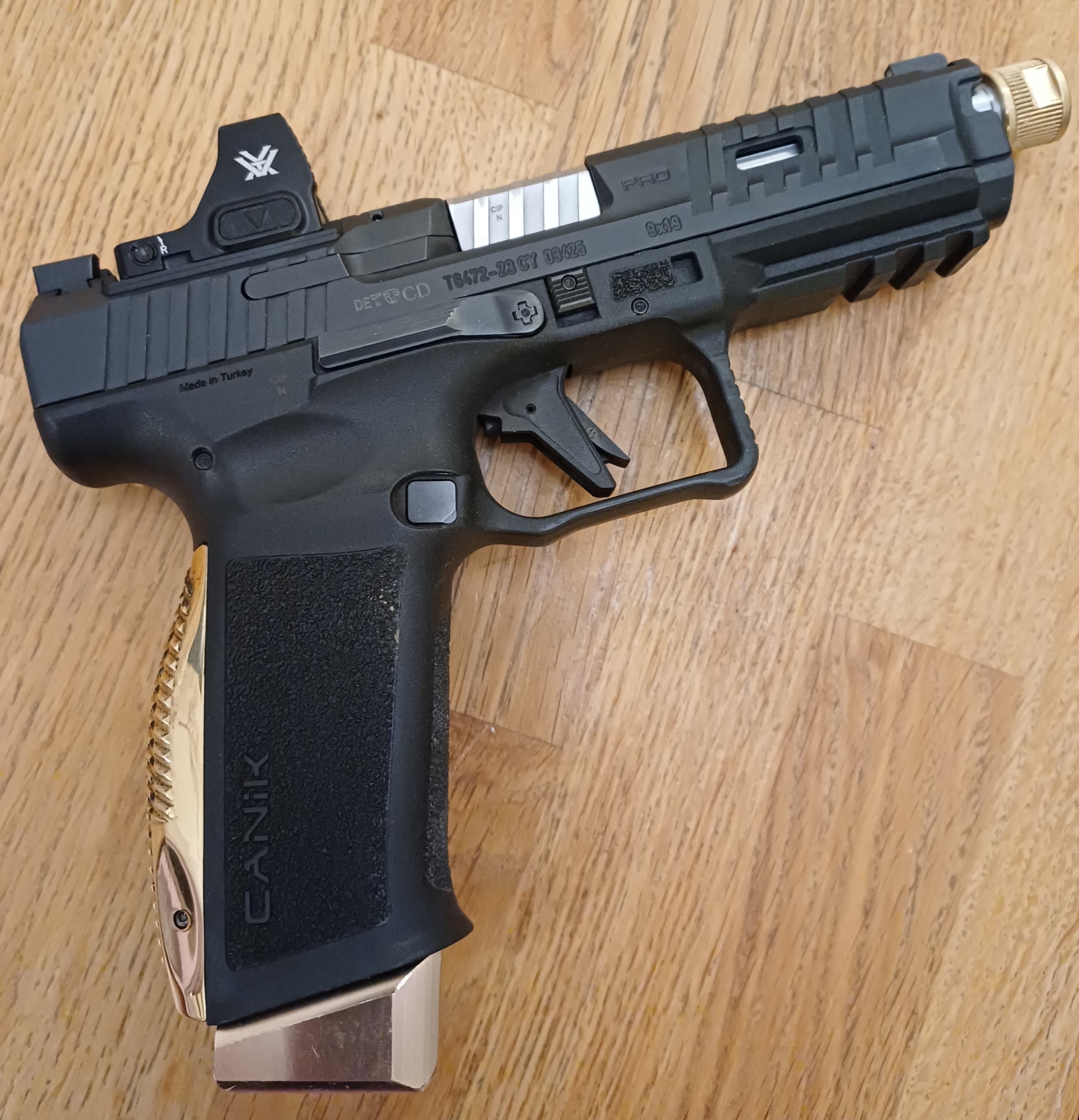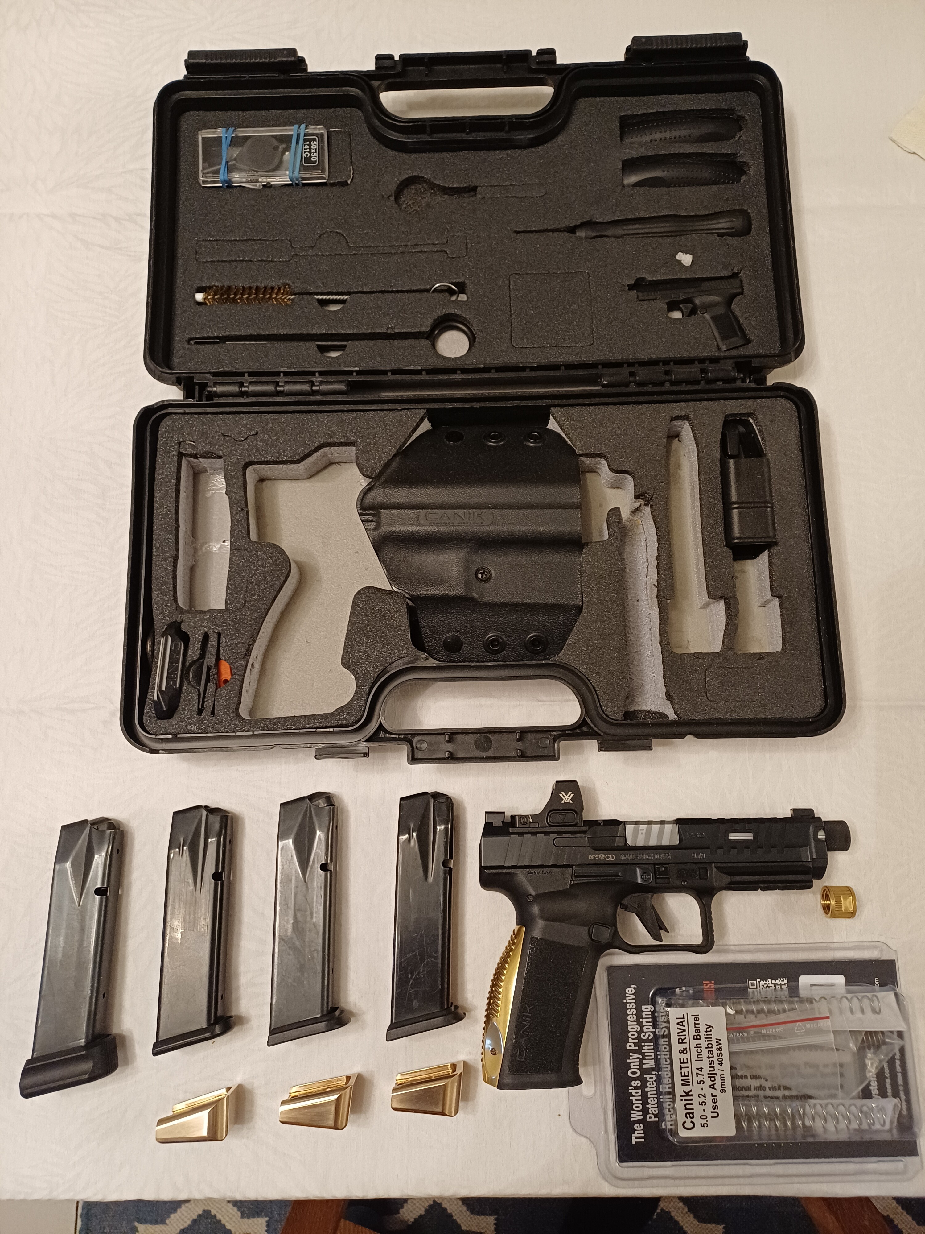 Canik original backstrap i mässing storlek medium. Small, medium och large backstrap i plast. Tre stycken egentillverkade magasinbottnar + ett gängskydd i mässing.