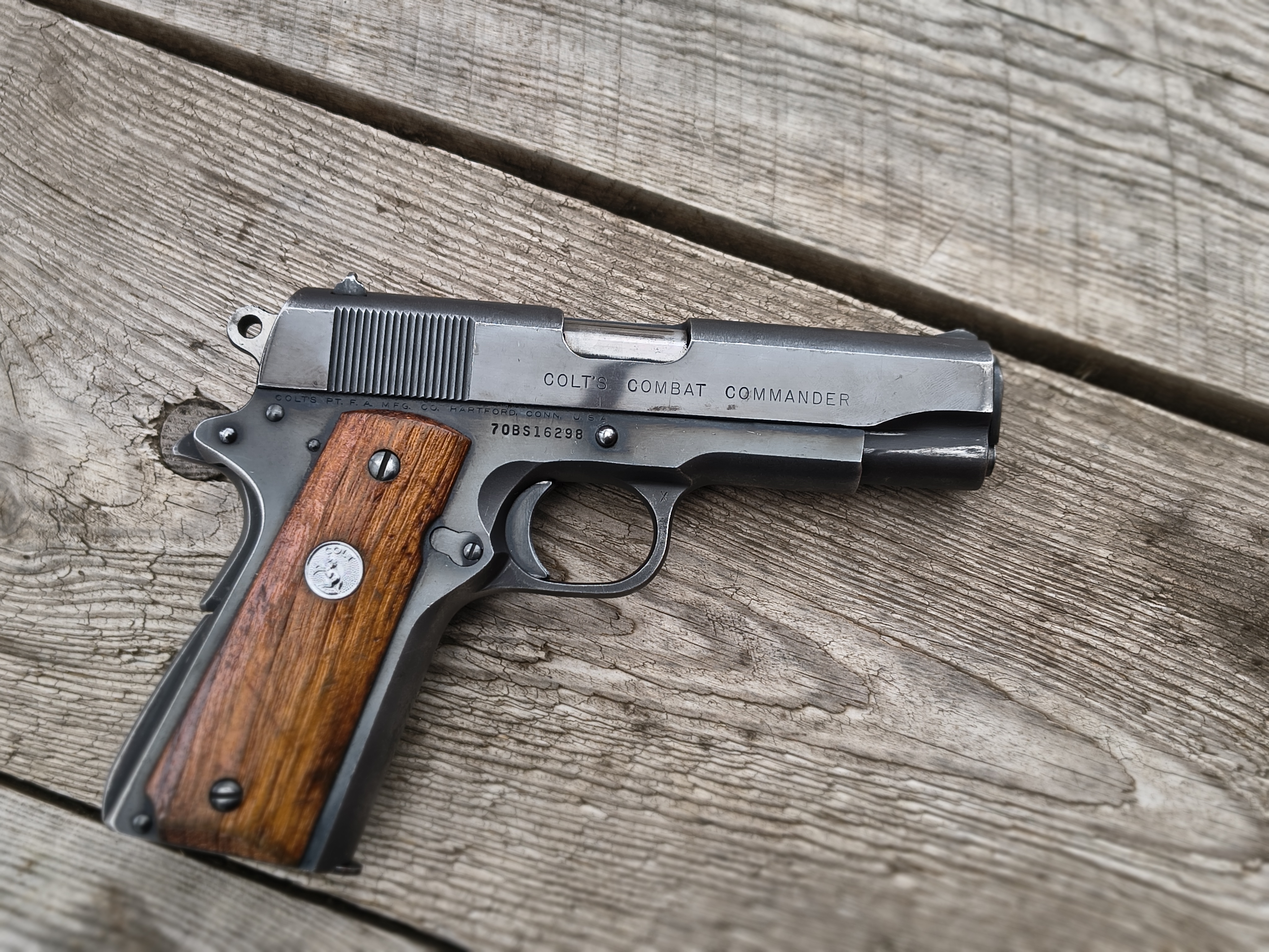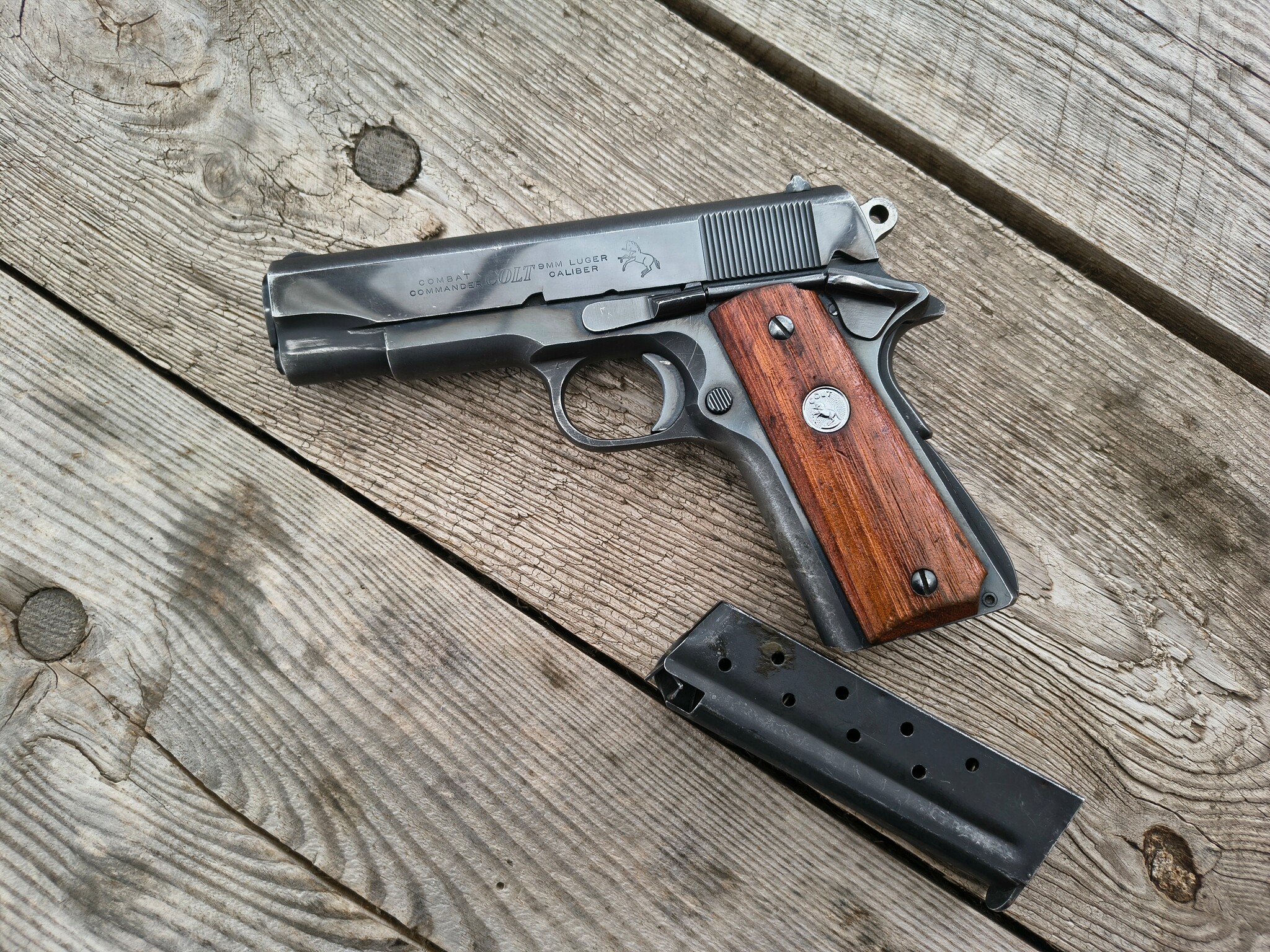 Colt 1911 combat commander I kaliber 9mm. Ett magasin. Funkar fint men har lite vacker patina.