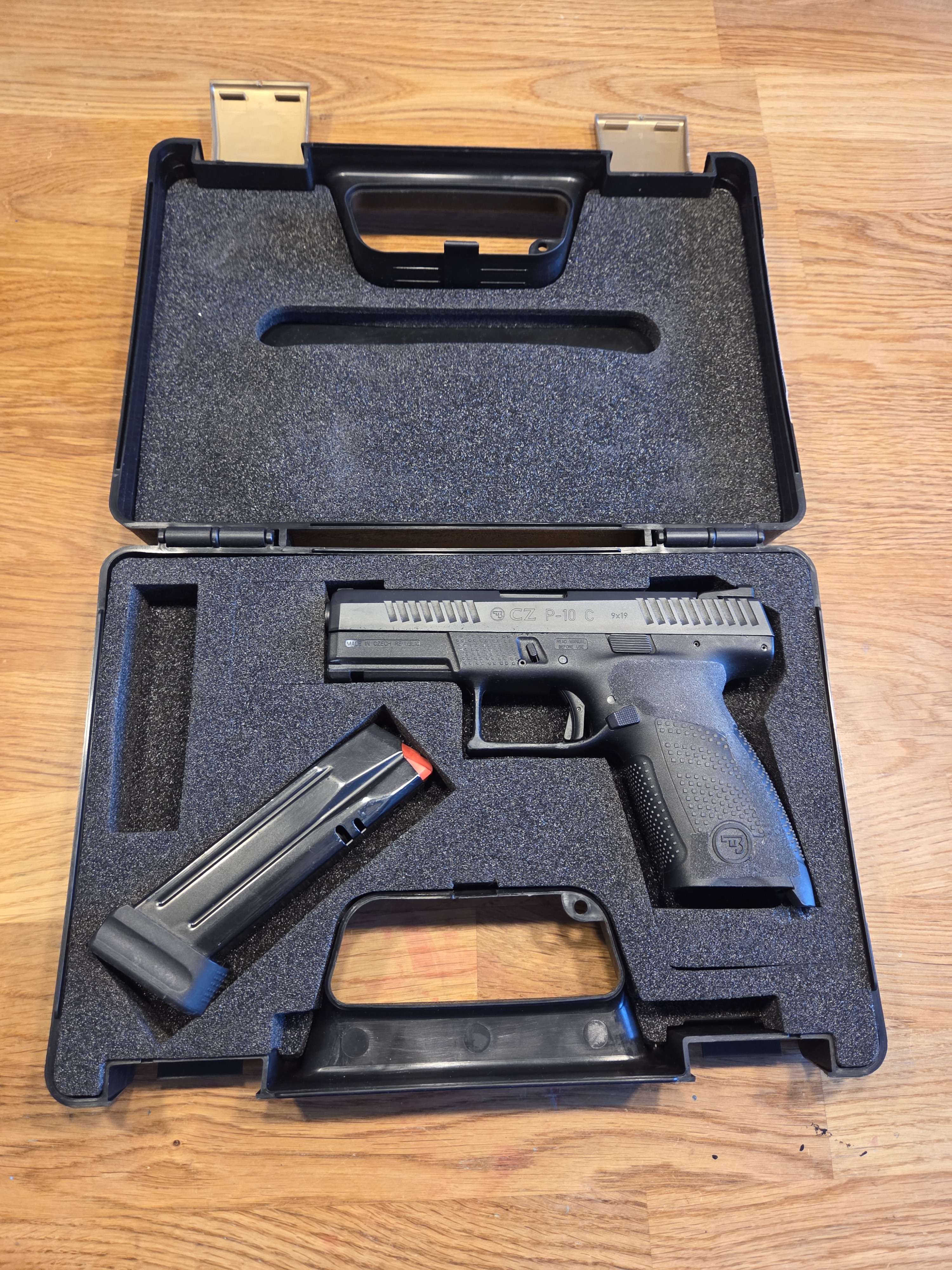 Mycket fin CZ P10C som gått under 500 skott. Sitter lite grepptejp på som kan tas bort om köparen önskar. 2 magasin, ett 18 skott och ett 15 skott, originalväska, enklare plasthölster och fjädrar för lättare trycke medföljer. Bättre ergonomi och bättre pipa än glock men med samma driftsäkerhet. Samma storlek som Glock 19 och passar i många av dom hölstren.