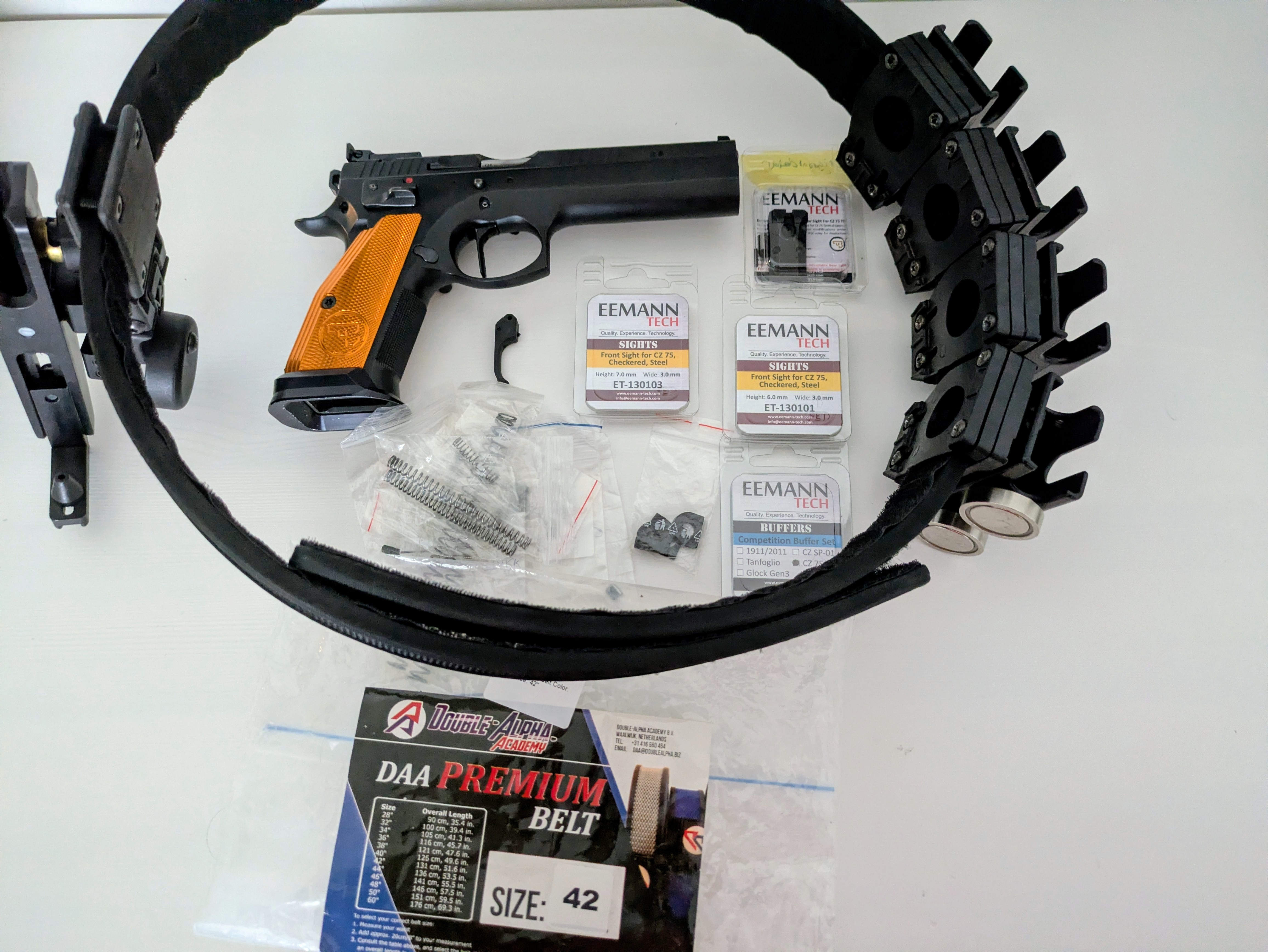Har bytt till ett justerbart Eemann sikte +korn+ rak avtryckare och starkare fjäder men originaldelar (fast sikte, fiberkorn,avtryckare,IPSC fjäder) medföljer. Finns några olika kornstorlekar, extra rekylfjädrar, buffers och annat smått och gott som medföljer.