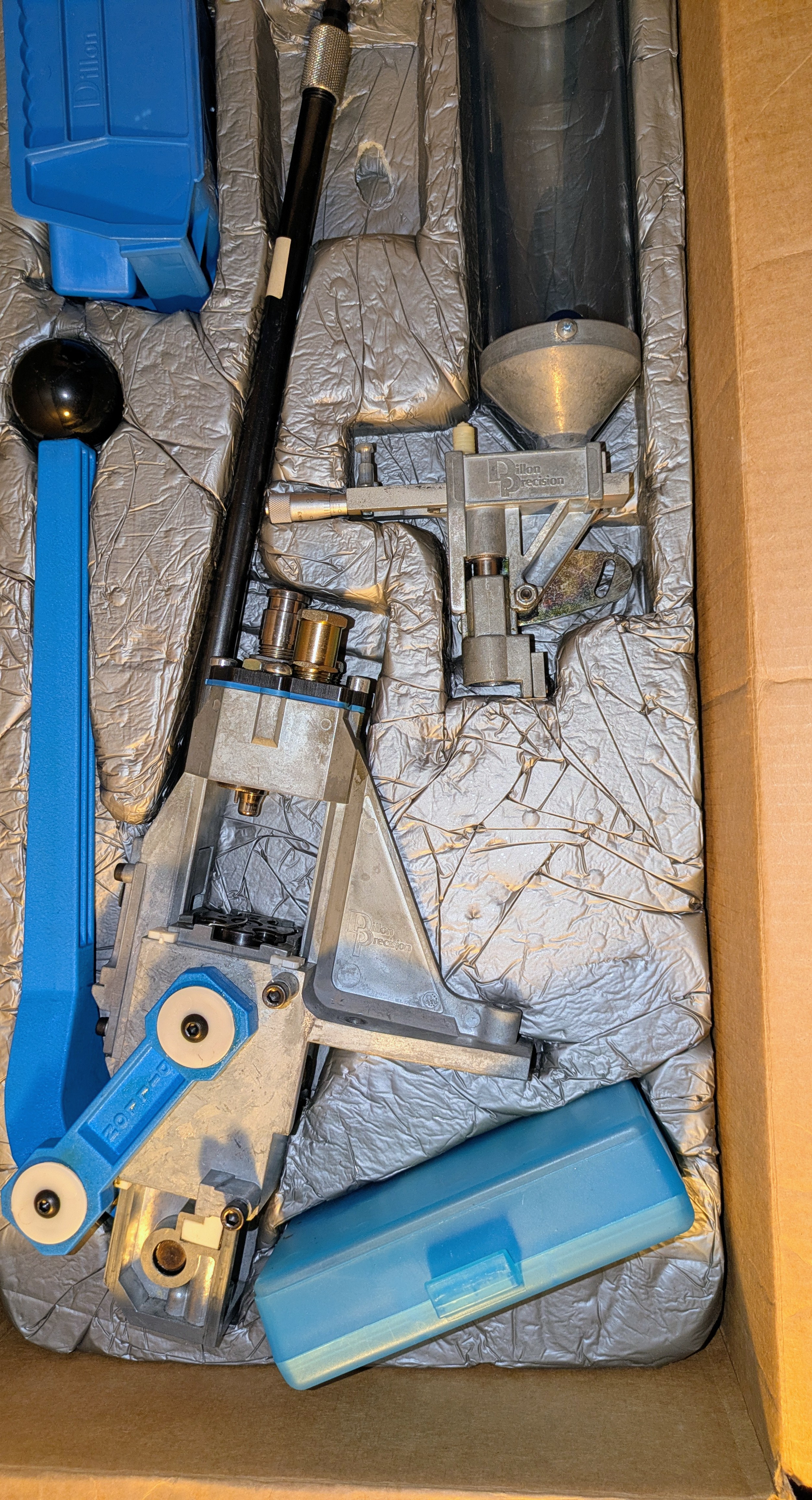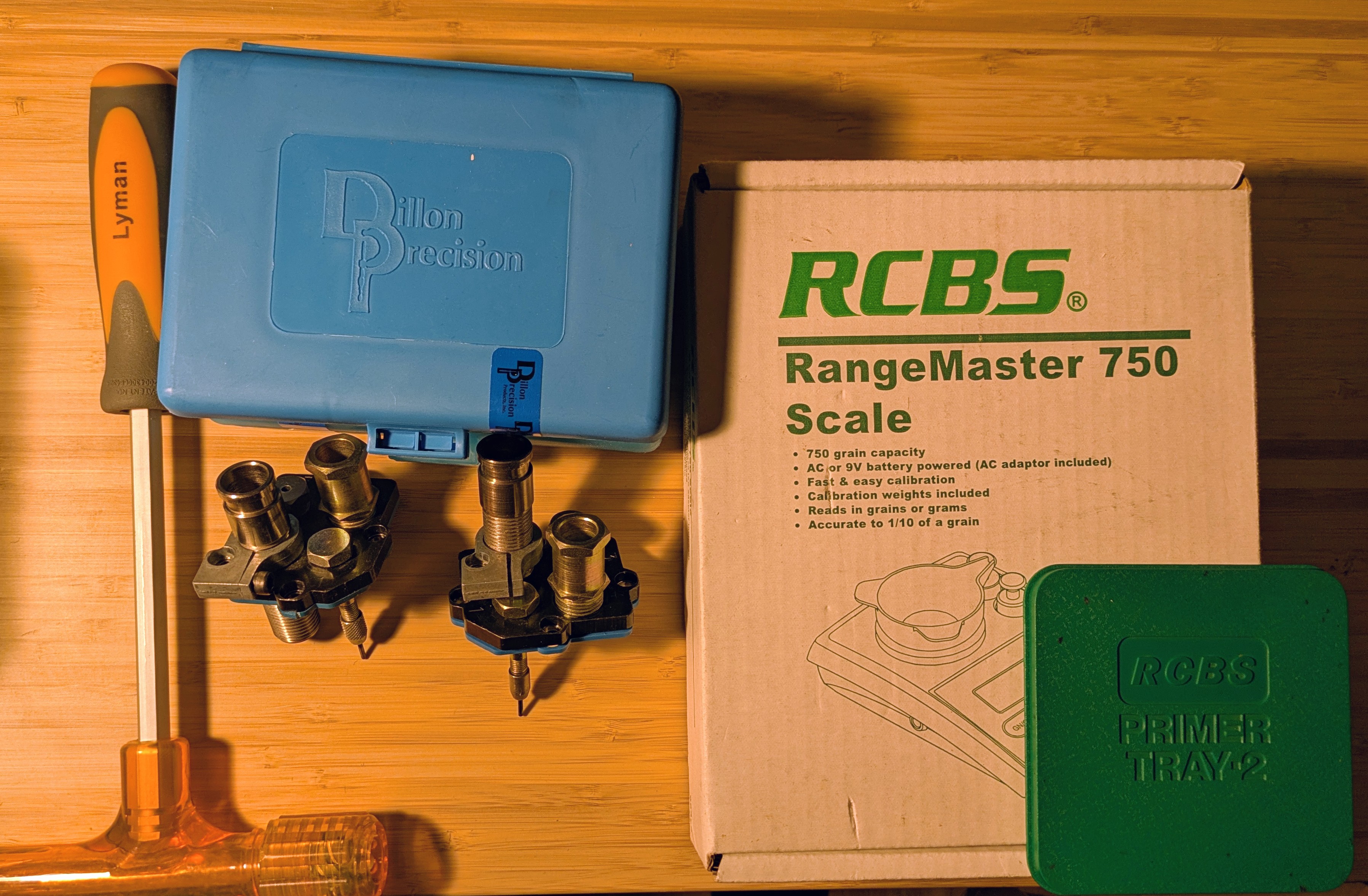 Komplett Dillon SDB med tillbehör,verktyg+verktygshuvud för 9mm, 45acp och .38/357. Säljer helst allt i ett kit men kan sälja 38/347 verktyget separat.