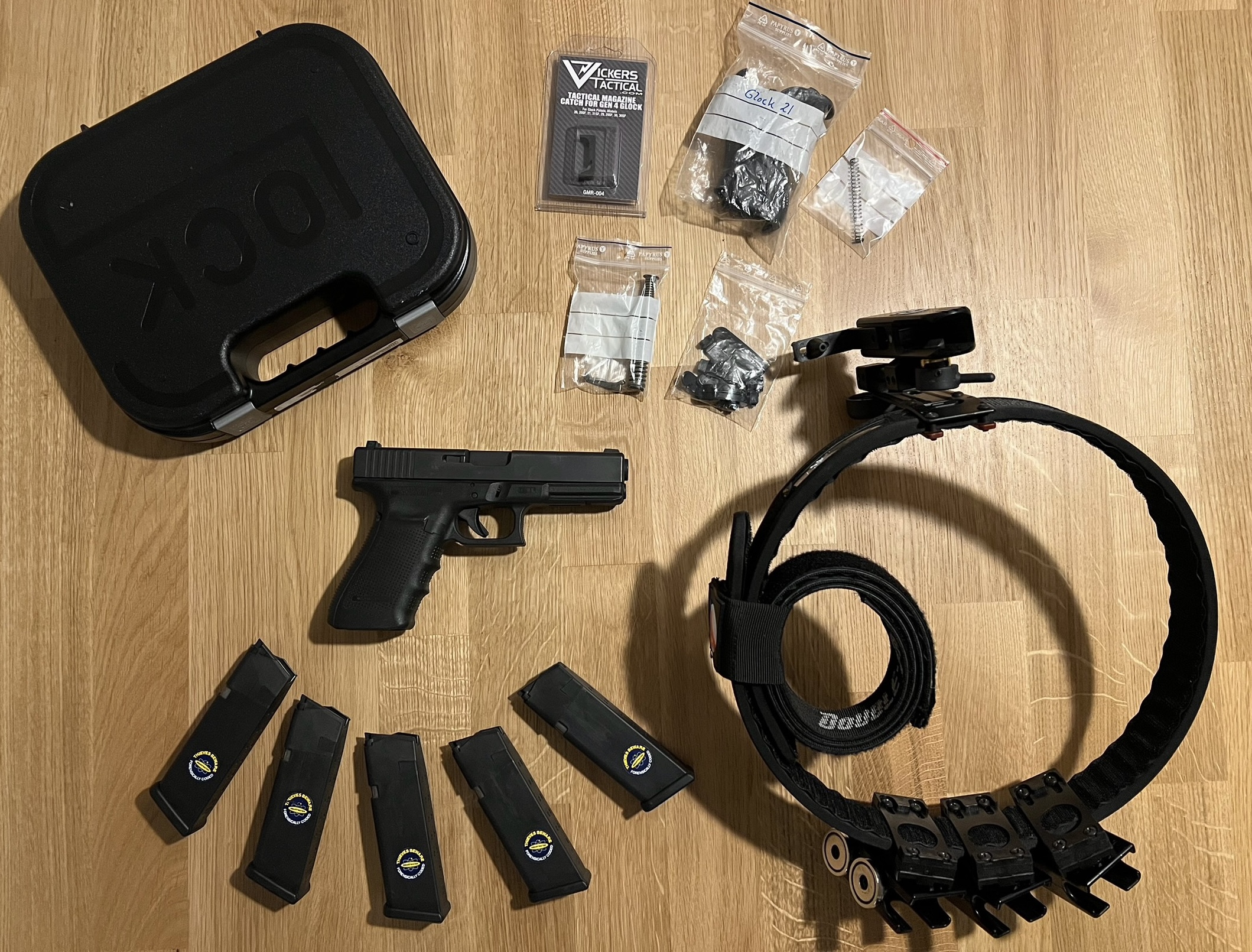 Originalveskan, 5 st. 13-skottsmagasin samt lite diverse reservdelar som fjädrar och längre magasinspärr ingår.