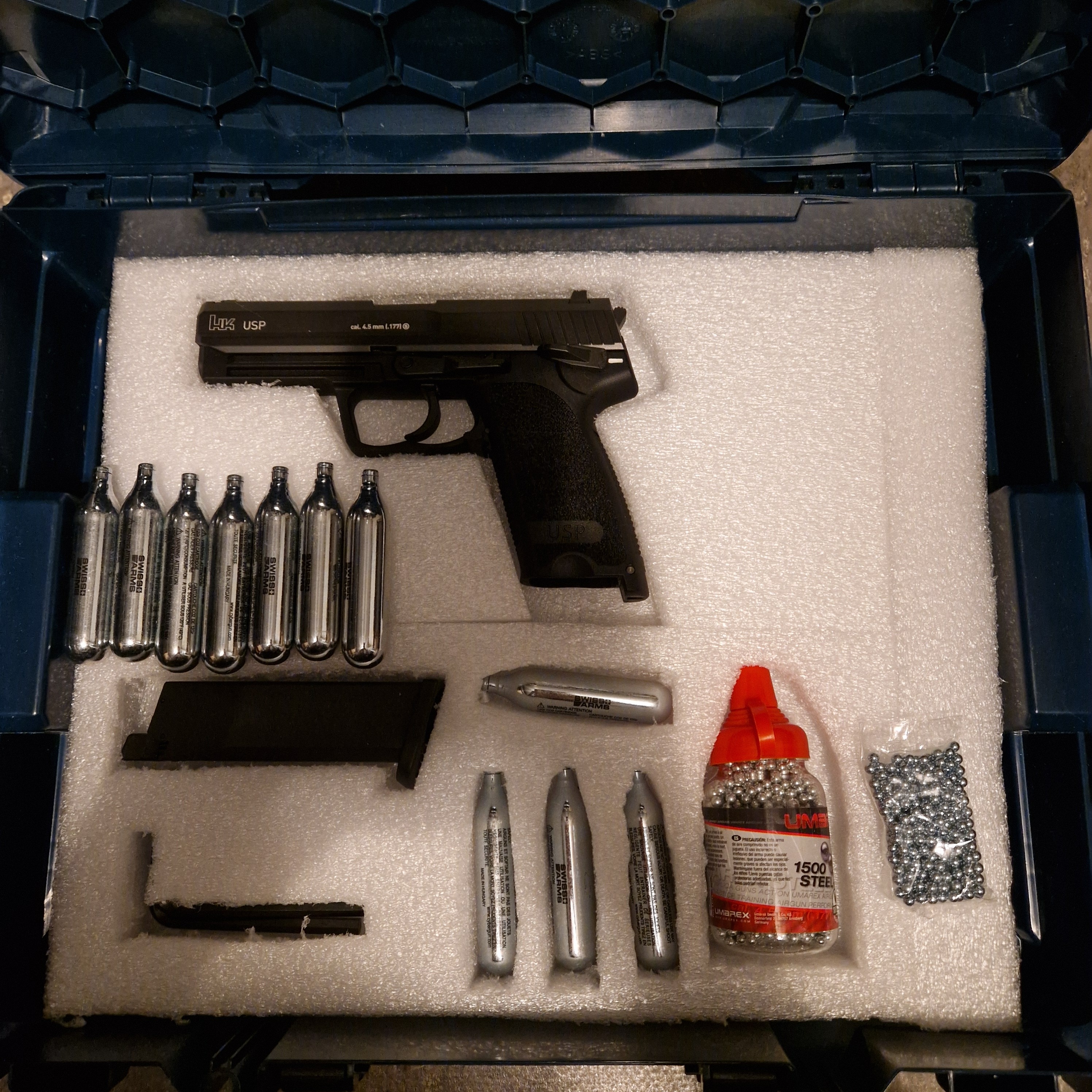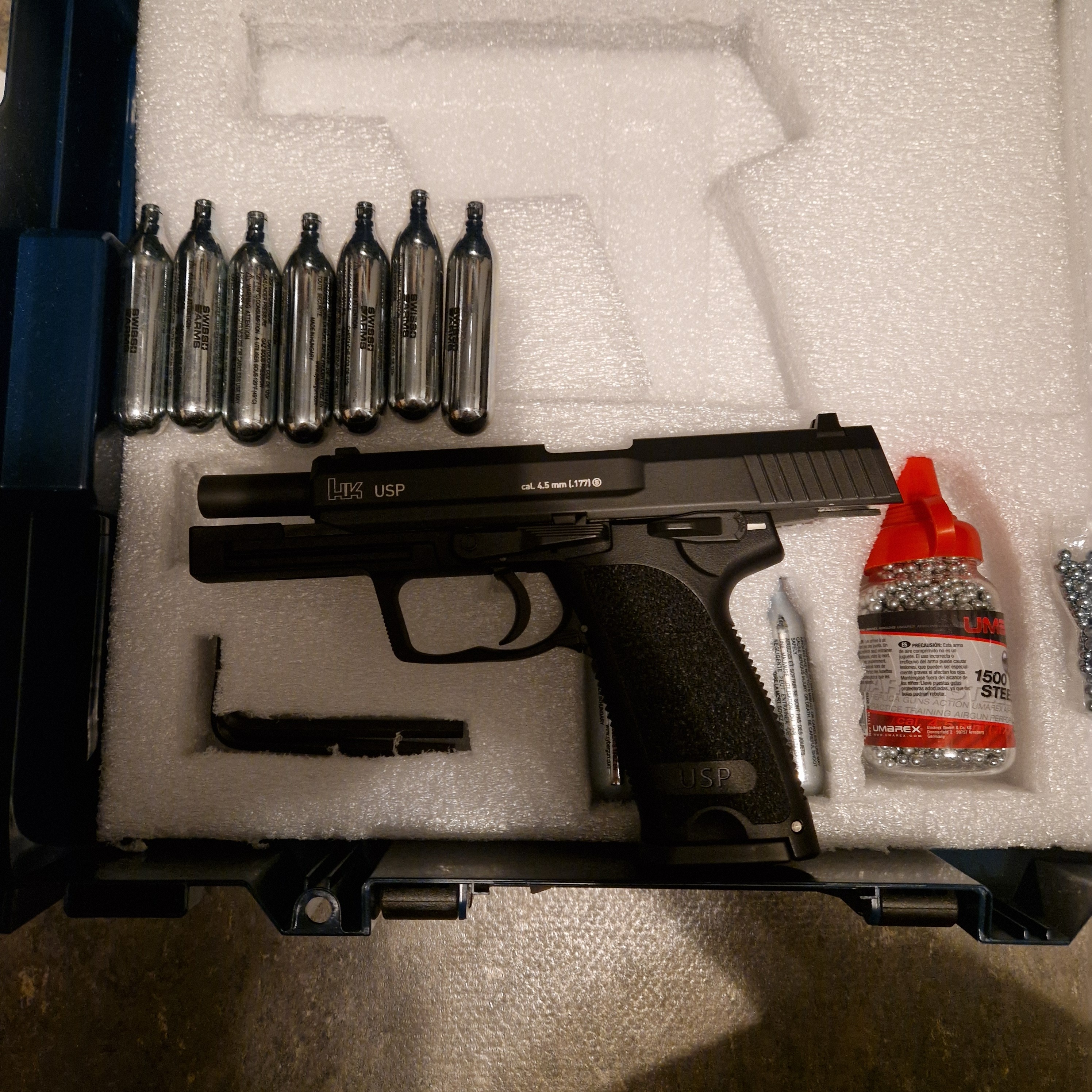 Kosyrepistol med blowback som är väldigt lite använd. Hade den endast som övning att hantera vapen när jag va nybörjare. Skjutit endast 20 skott med den. Undrar du något mer så fråga.