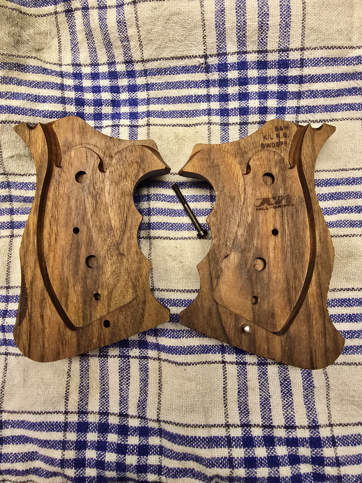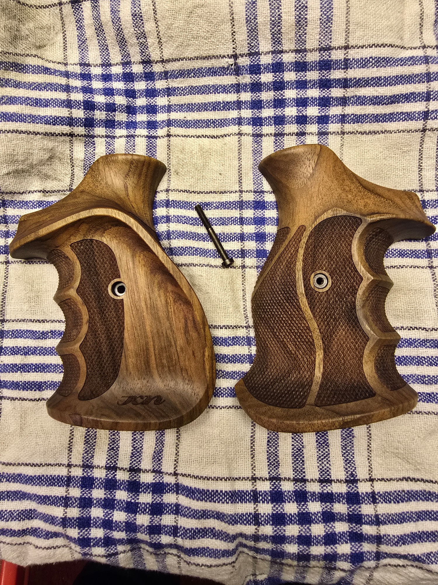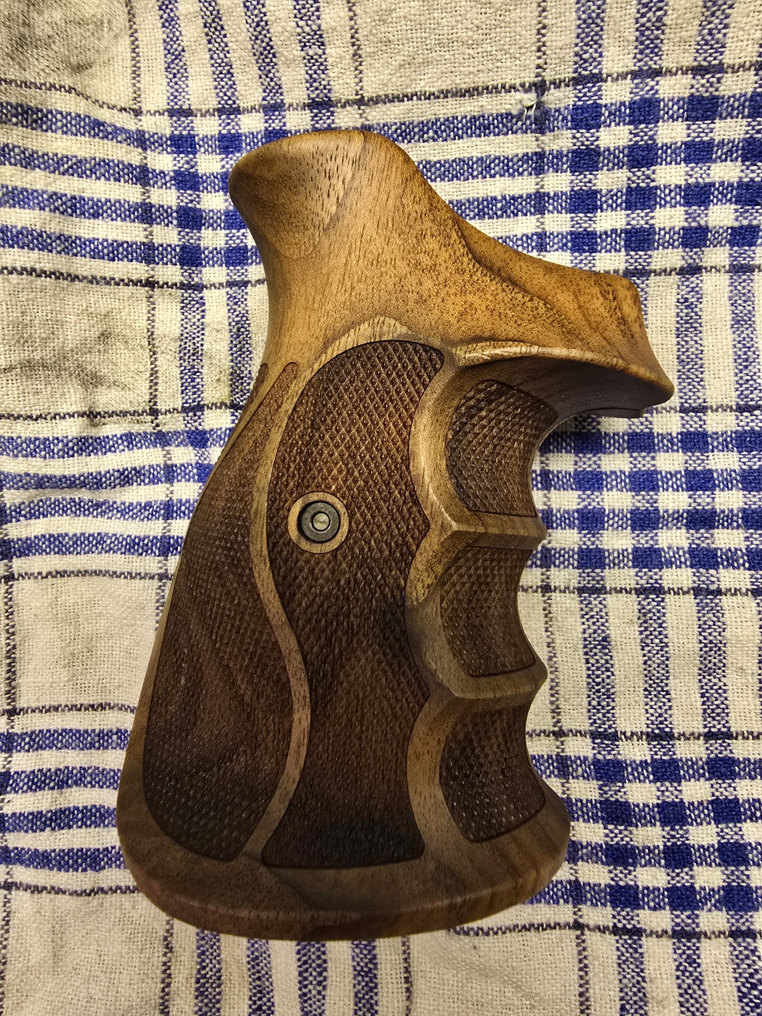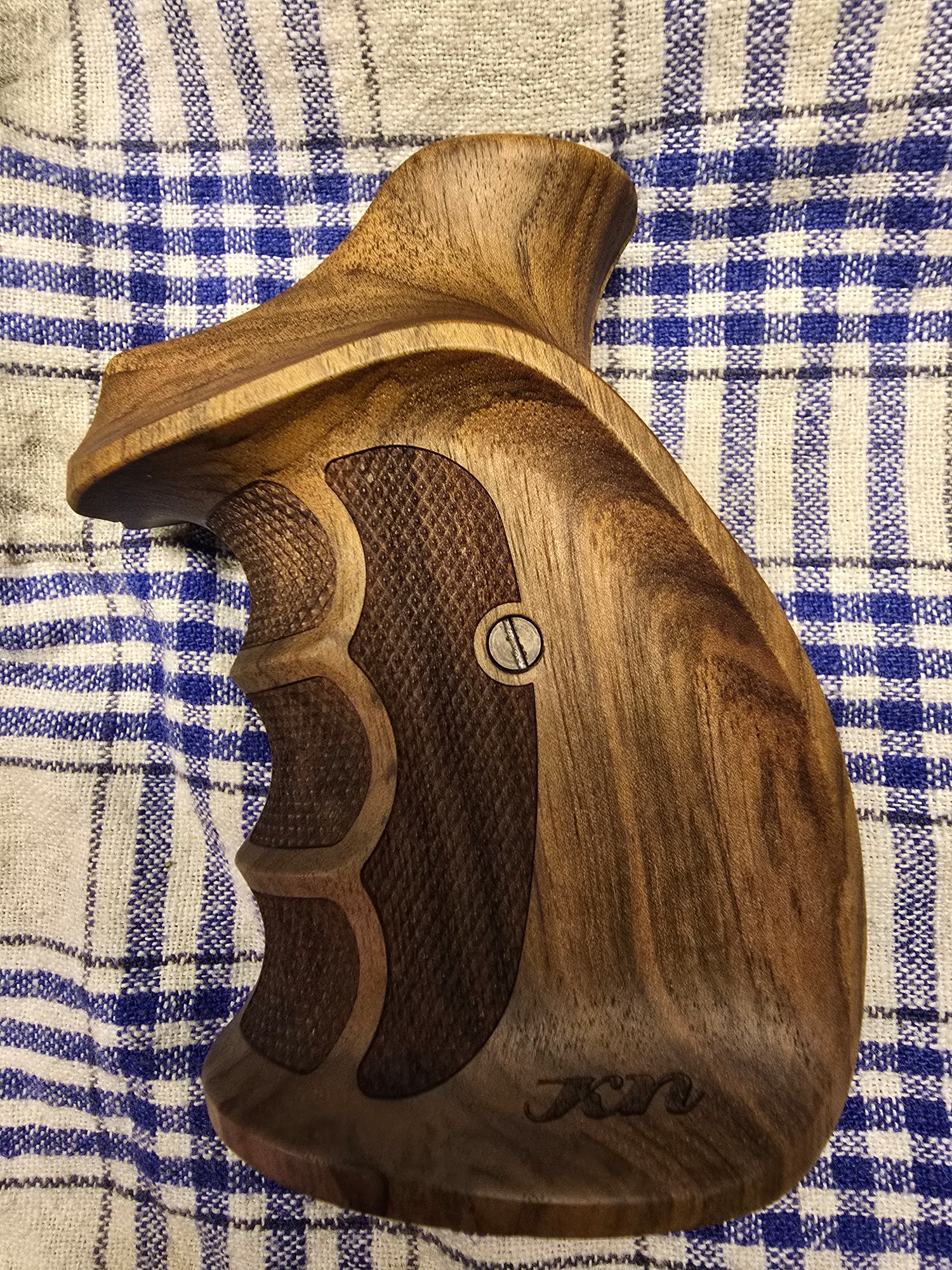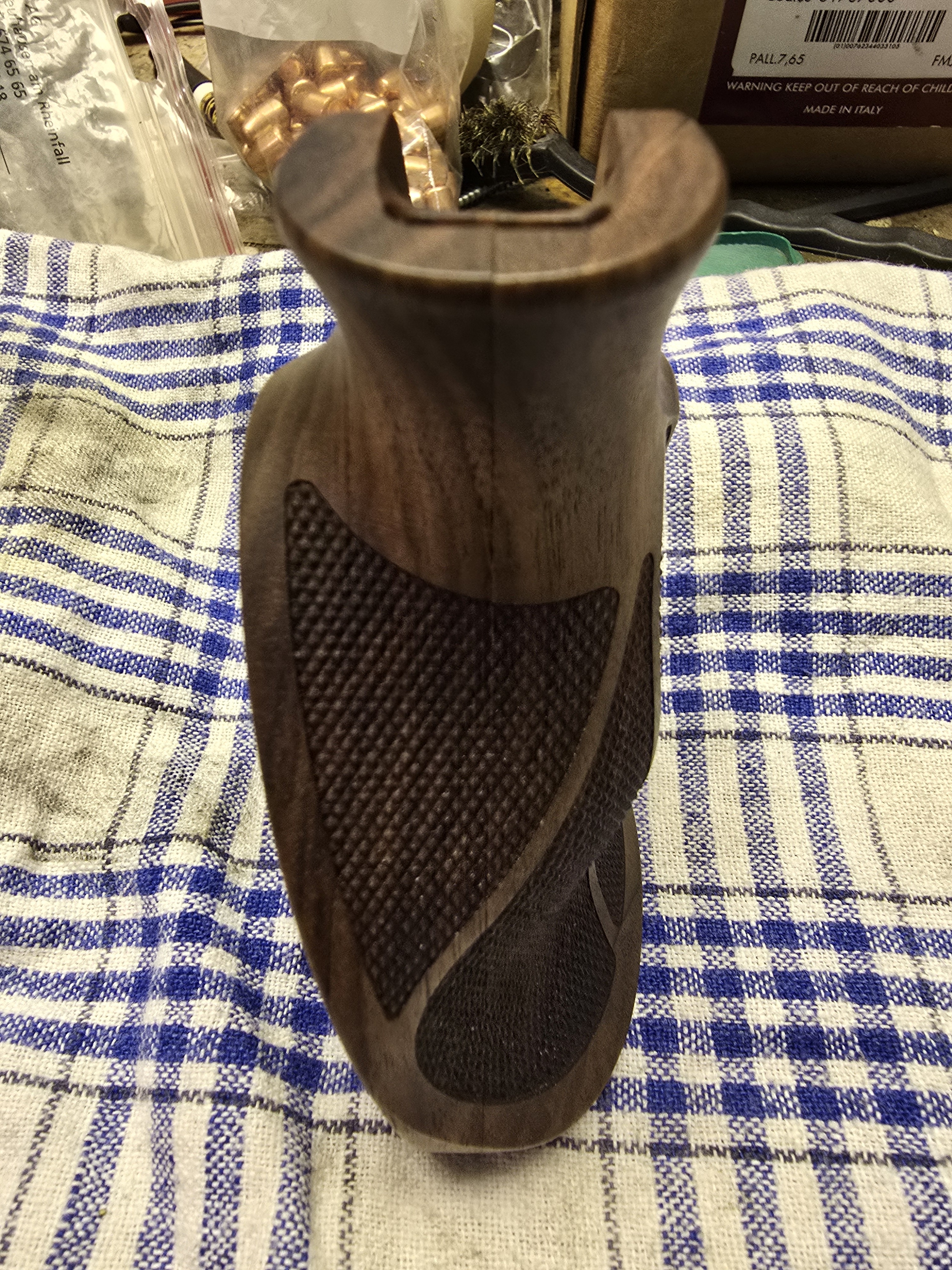 Hej Anders, tror att den bara finns i en storlek. Jag har storlek 10 i handskar och korta fingrar men kan skjuta doubleaction ändå.