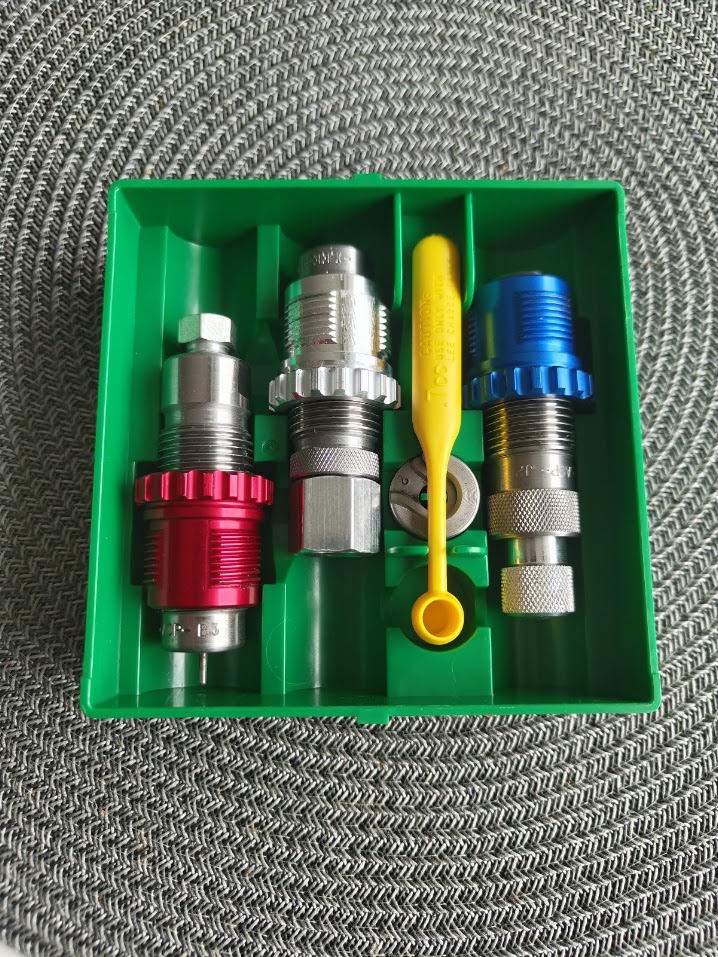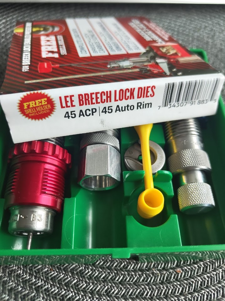 Ett mycket lite använt 3 die set Lee Carbide .45ACP laddverktyg med Breech Lock adapters säljes.