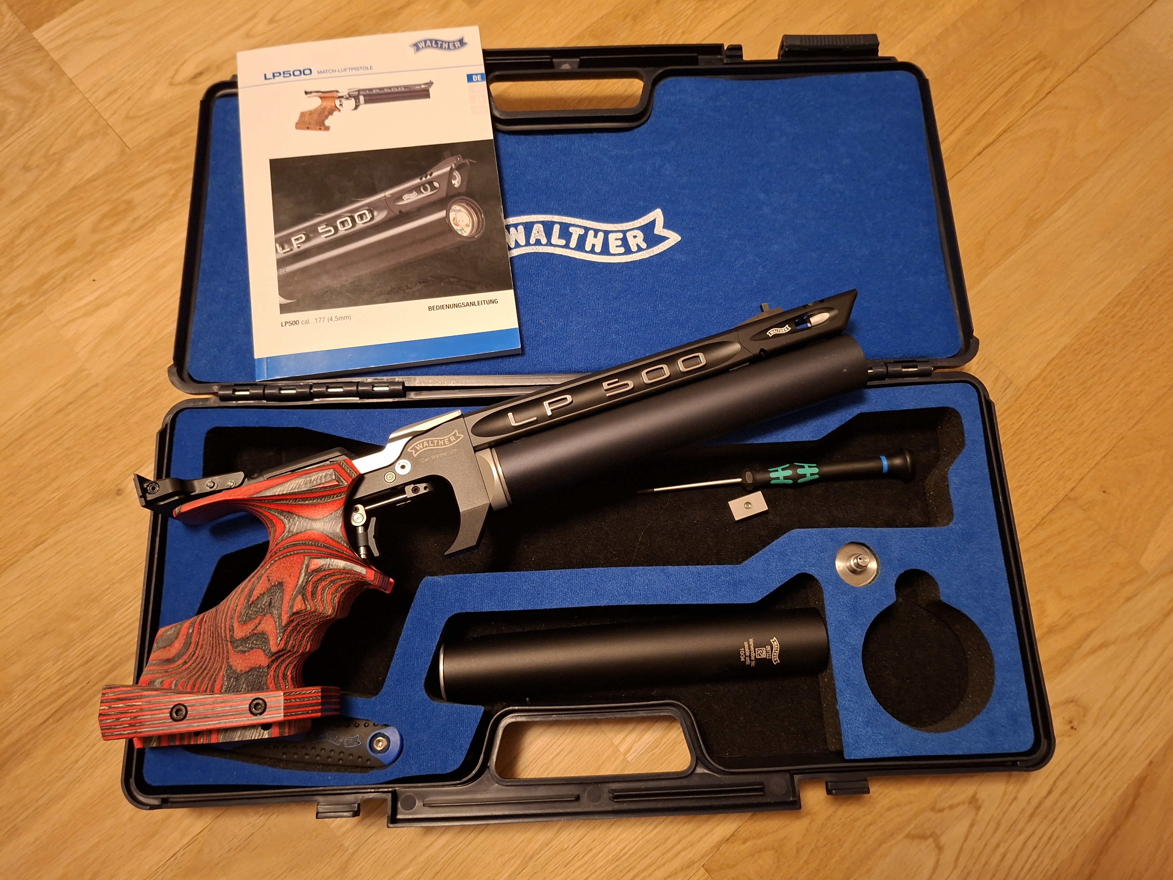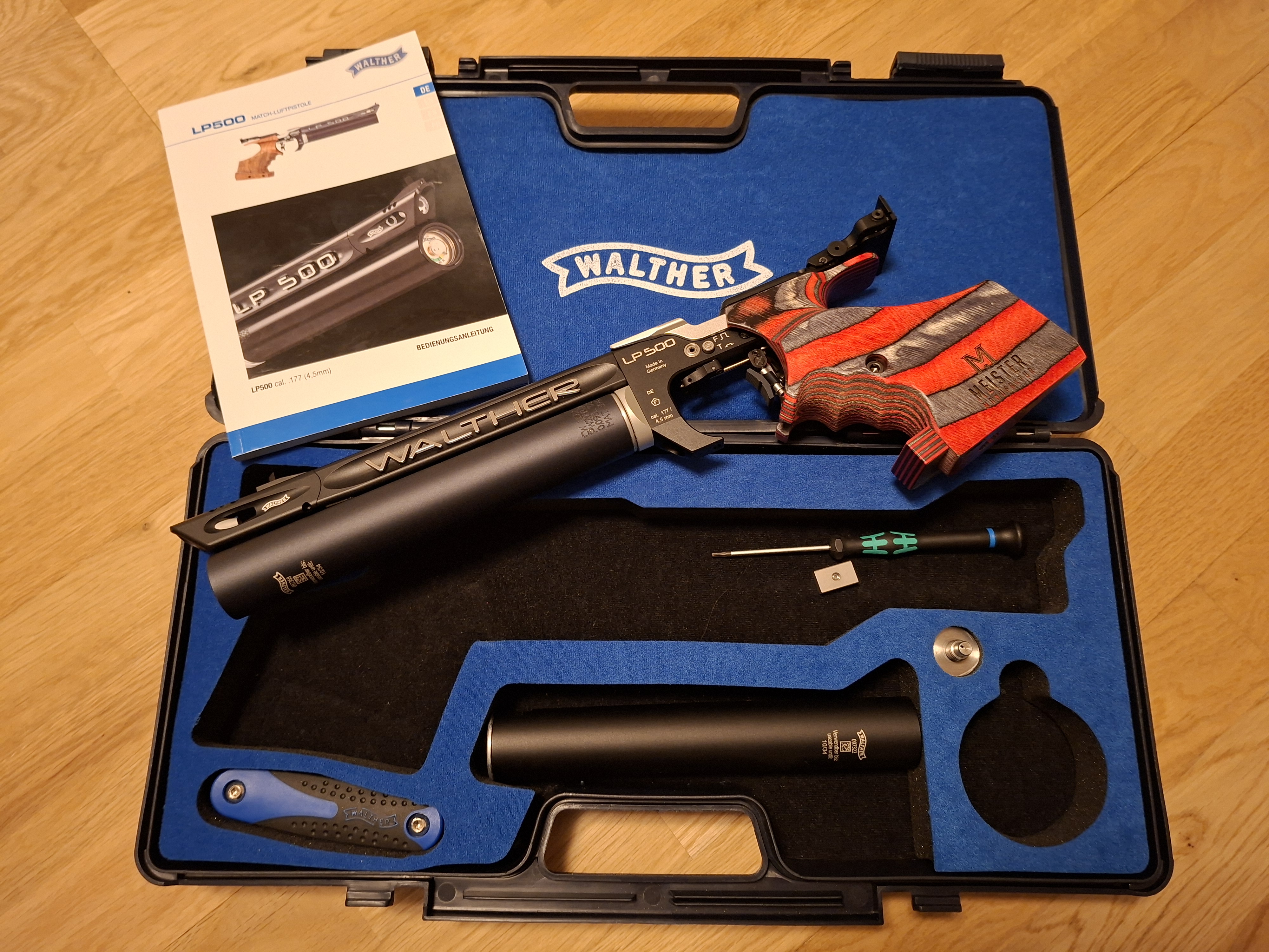 Säljer en 1 år gammal Walther LP 500 Expert “Limited Red Devil” med Meister Manufaktur Mediumkolv, 2 tuber med tillverkningsdatum10/24, pipvikt, verktyg, påfyllningsadapter i orginalväskan.