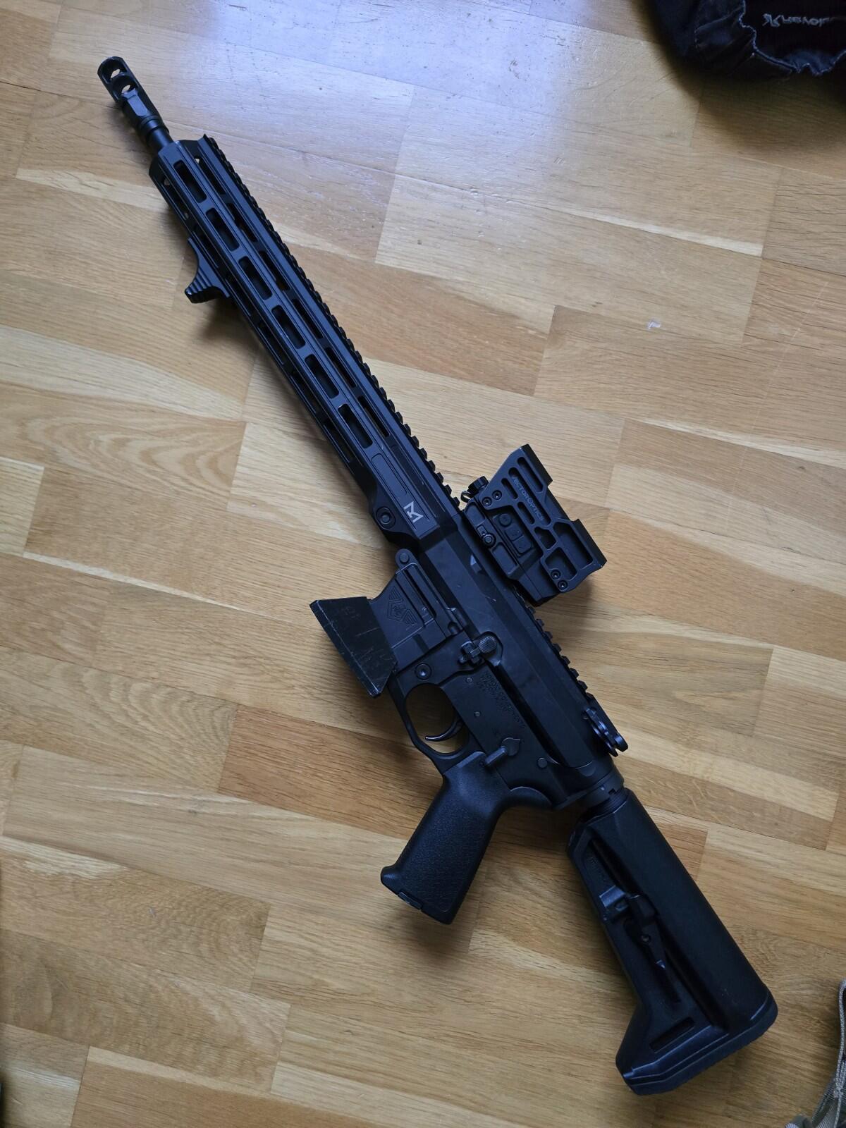 Den är 16tum med compen så den INTE godkänd på jakt.mer info finns här. Sitter en JP tryck i den. Ca 1000-1500 skott ur den. Finns i Trollhättan.