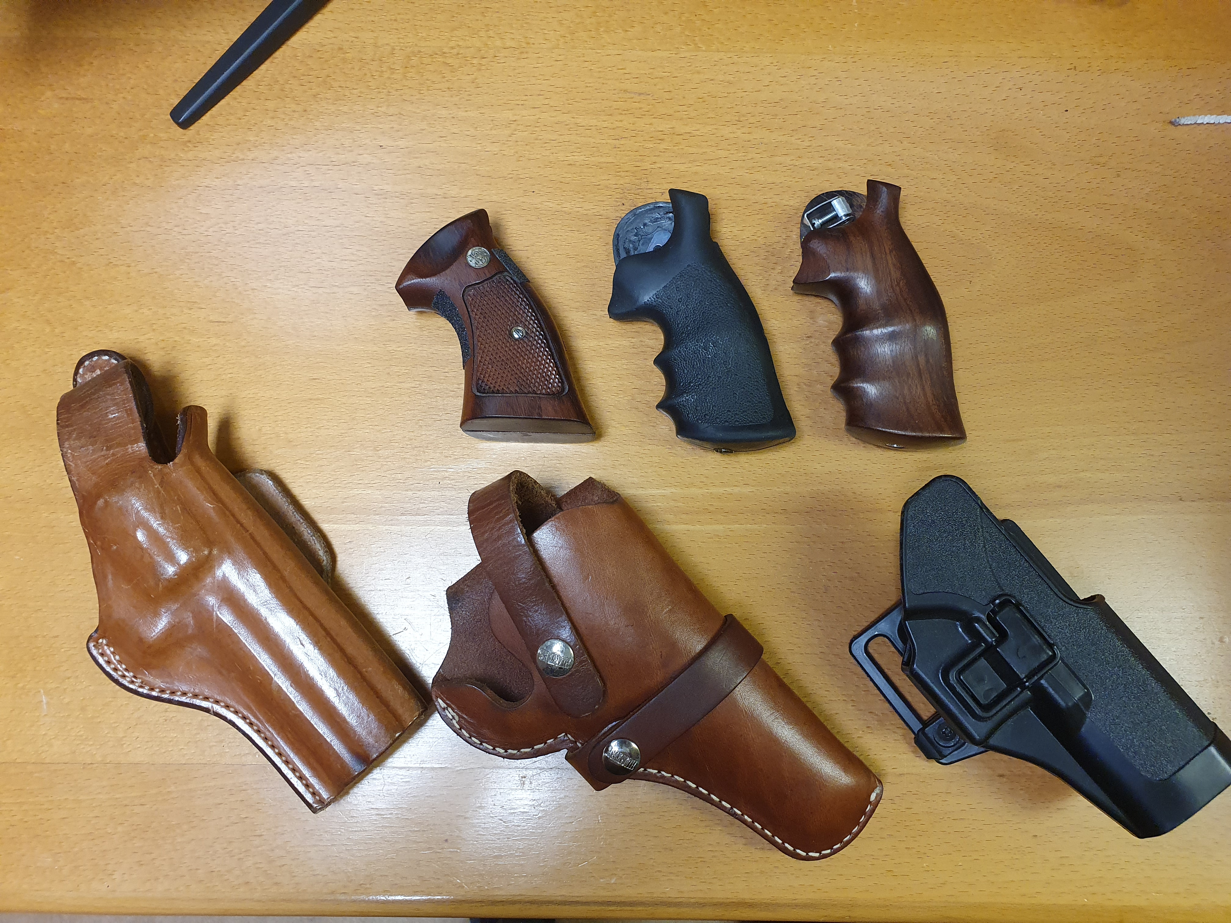 Vänstra bruna hölstret är ett Bianchi. Passar S&W K-stomme 4". Jag tror det är kortat… 300kr