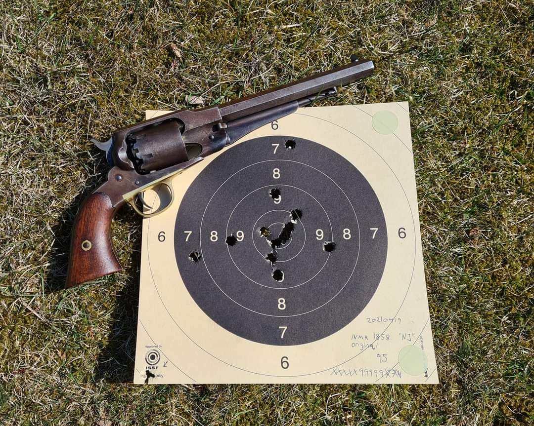 En Remington 1858 new model army “NJ” stämplad i väldigt fint skick. Pipan är i ett fantastiskt bra skick med knivskarpa räfflor och bommar och trumman är fin kal .44. Dock är trumman omärkt men det är troligen den ursprungliga då det var vanligt med omärkta trummor på dessa, trumman är original och de har hängt ihop sedan 1860 talet… Alla stämplar finns, tydlig pipadress osv osv. Kanske 30% blånering kvar. Inga rostporer i metallen. Spalten mellan trumma och pipa är supertajt (0,1) och glapp I sidled ca 0,5, låser fint mekaniskt. Står skrivet namn på insidan av kolvplattorna med blyerts.