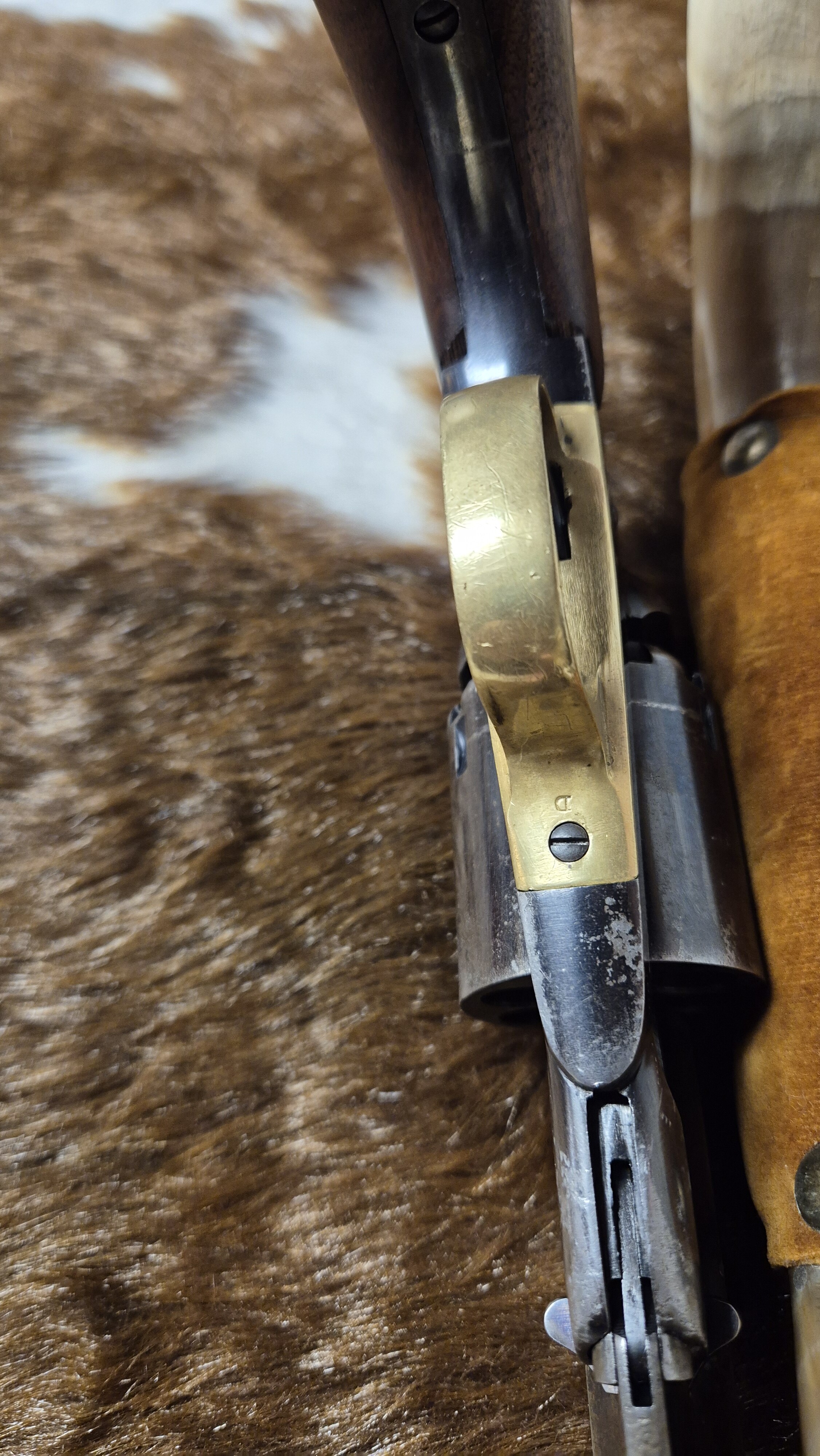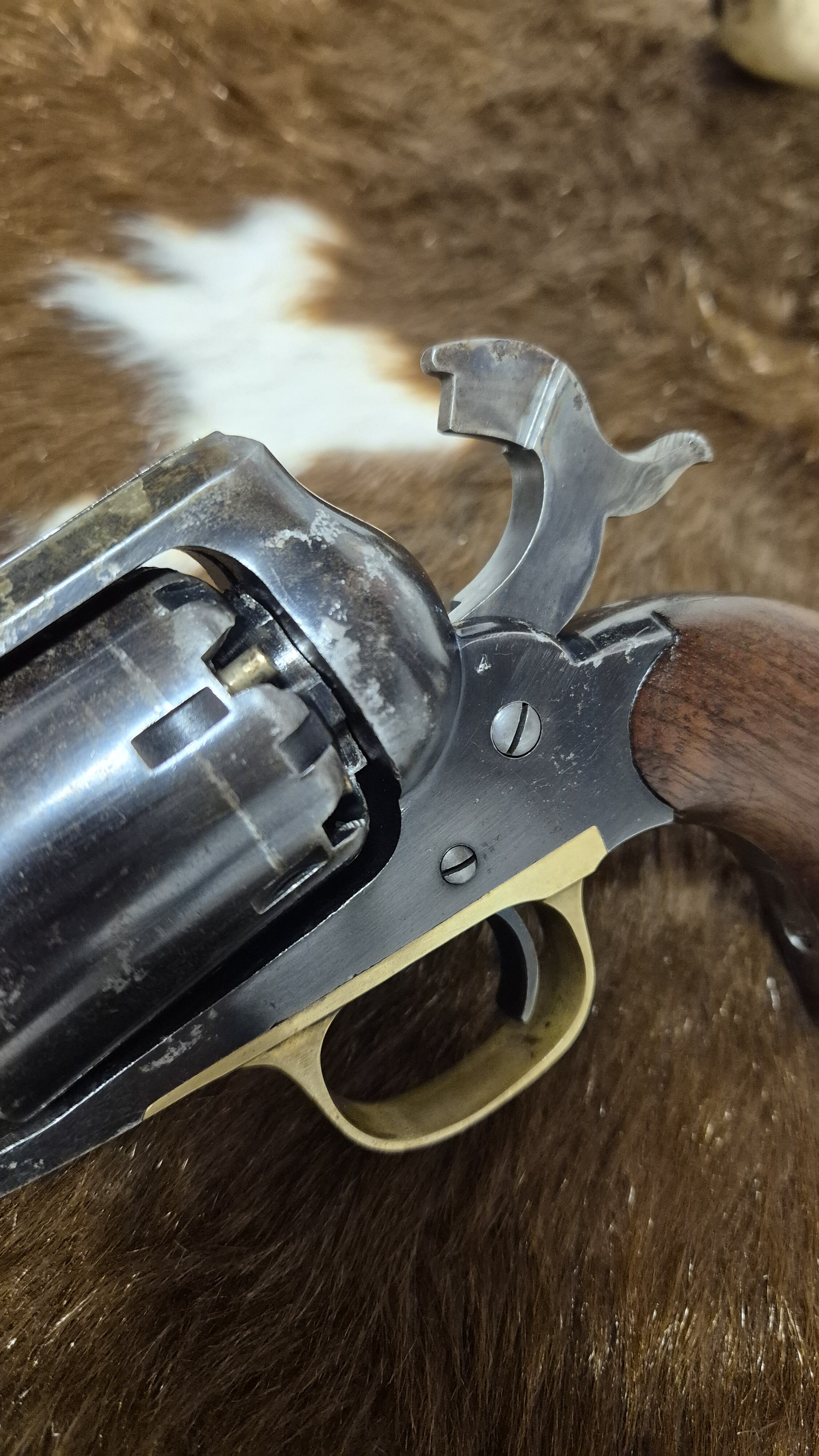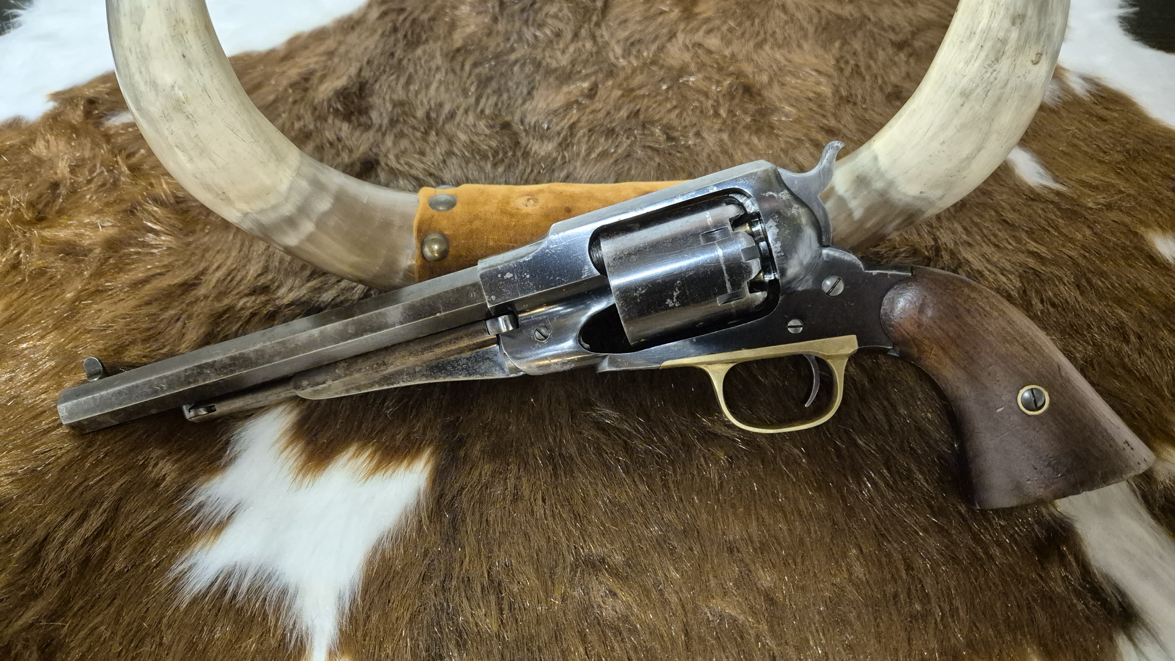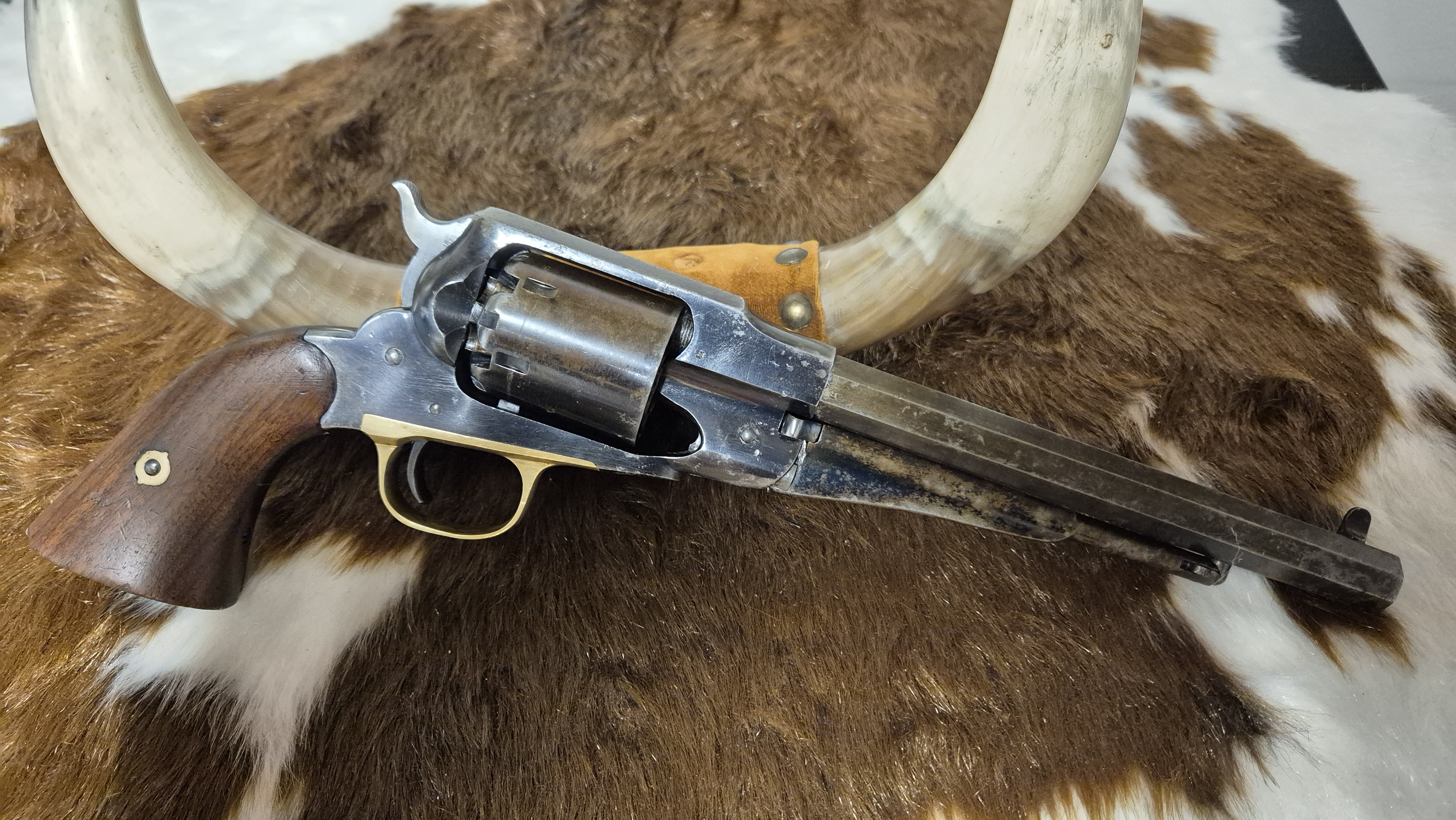 Här har vi en Remington 1858 new model army cal. 44 i mycket gott skick. Mycket original blånering kvar, stomme ca 80%, trumma ca 60%, pipa laddarm 30%. Även i kammrarna finns en hel del blånering kvar. Mekaniskt perfekt. Spel mellan pipa och trumma 0.20mm. Loppet i pipan är fantastiskt, I det närmaste nyskick. En verklig samlar revolver. Någon verkar ha bytt till ett högre korn, kanske för banskytte? Skulle någon vilja använda den till skytte så finns nog inga begränsningar för vad den skulle prestera. Har fler bilder om så önskas.