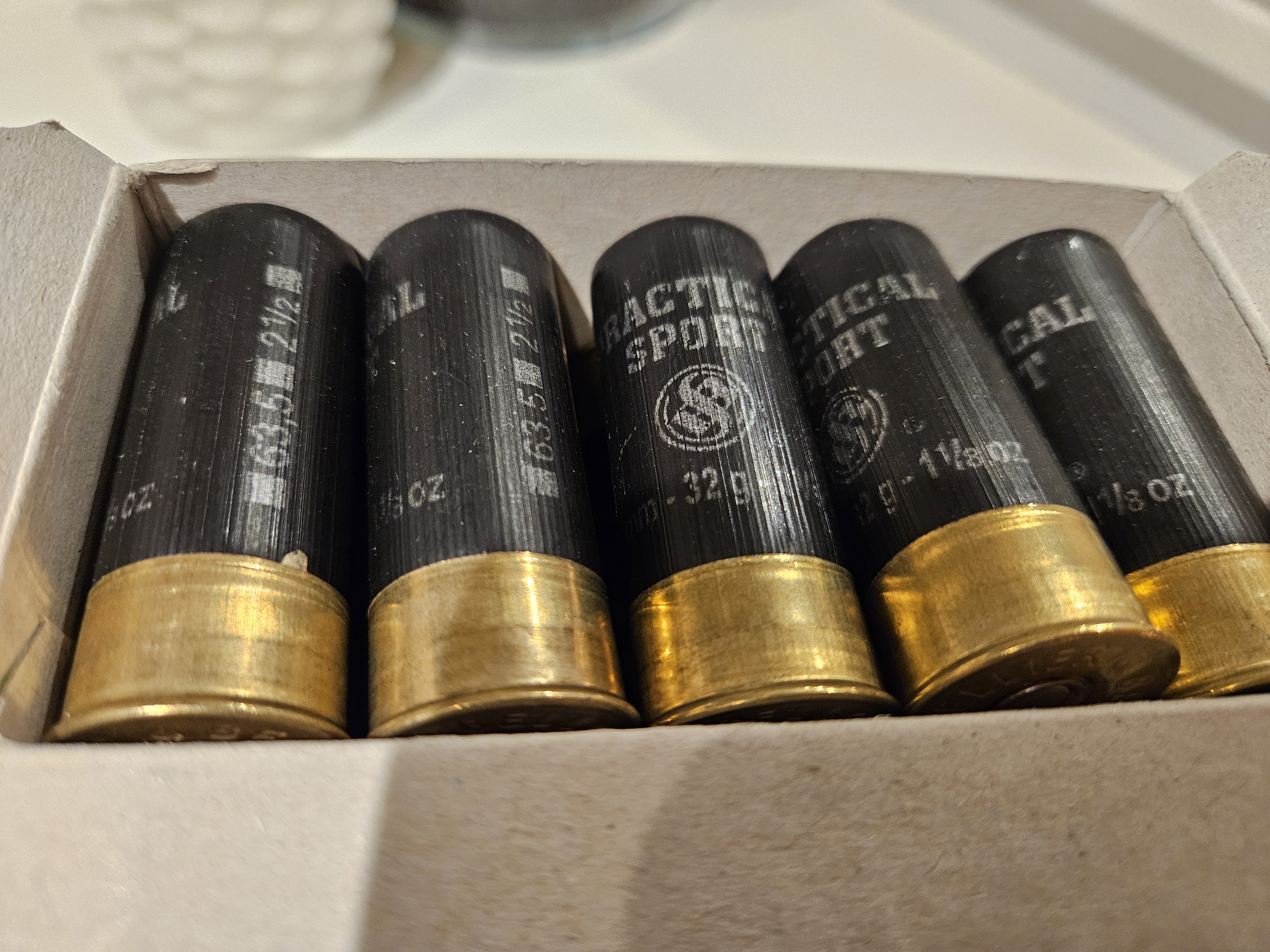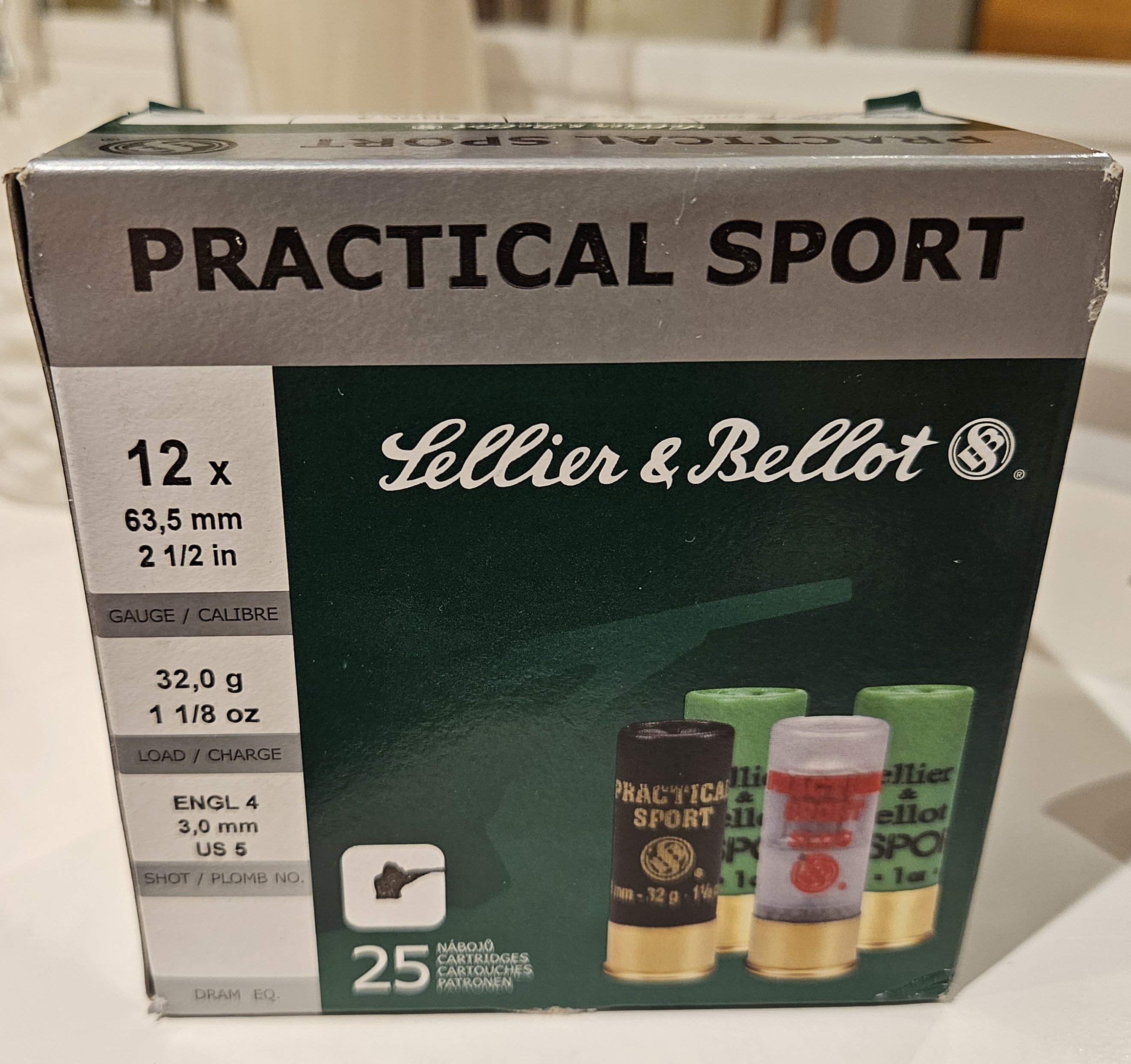 1 ask med 25 patroner kal 12 / 63,5 Practical Sport. Kortare patroner än 12/76. Kulstorlek: US5 = ENGL4 = 3,0mm diameter kulor. Laddvikt : 32 Gram Utgångshastighet: 385 m/s