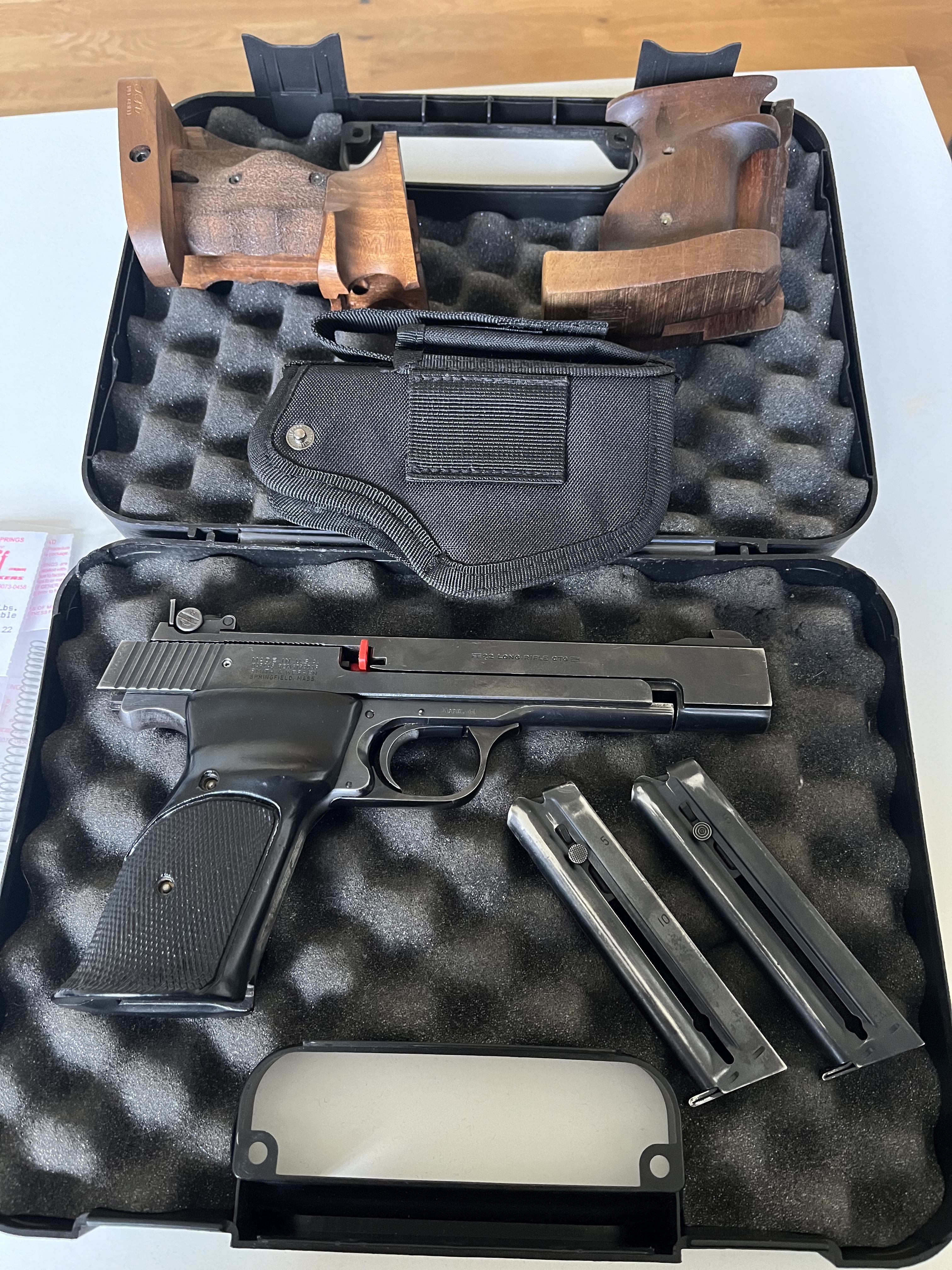 Smith & Wesson M41 .22lr. Ingår 3 st olika kolvar. Originalkolven som är renoverad och lackad. Nill-kolv L/XL samt ytterligare en ergonomisk kolv i stl M. Ingår även Wolff trimningskit rekylfjäder samt fjäder för slagstift. Ett väl fungerande hölster medföljer också.