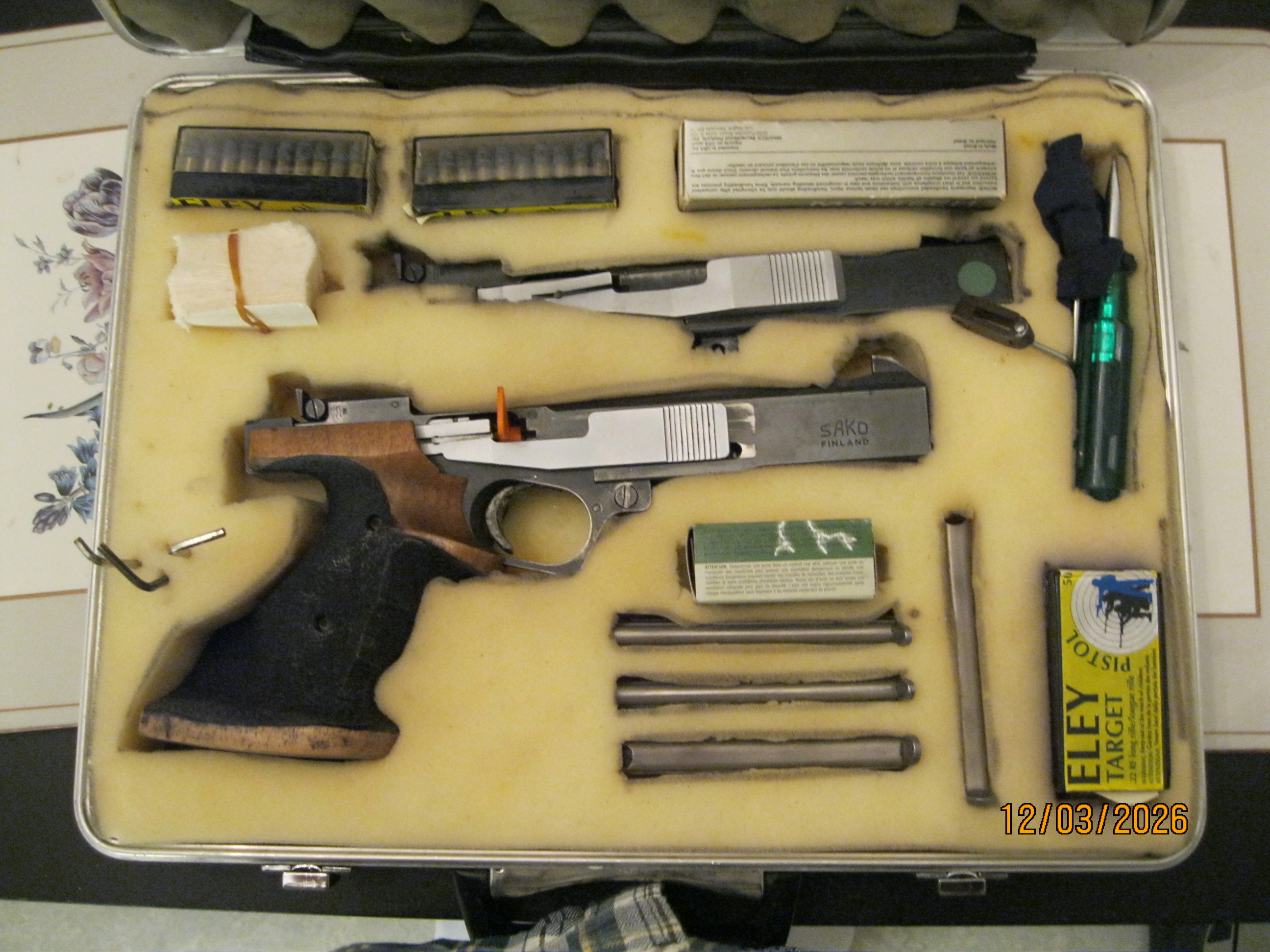 Förvaringsväska för komplett vapen och 32 växelsatsen med extra reservdelar som extra korn och siktblad. Finns med en hylsfångare, har inte provat den.