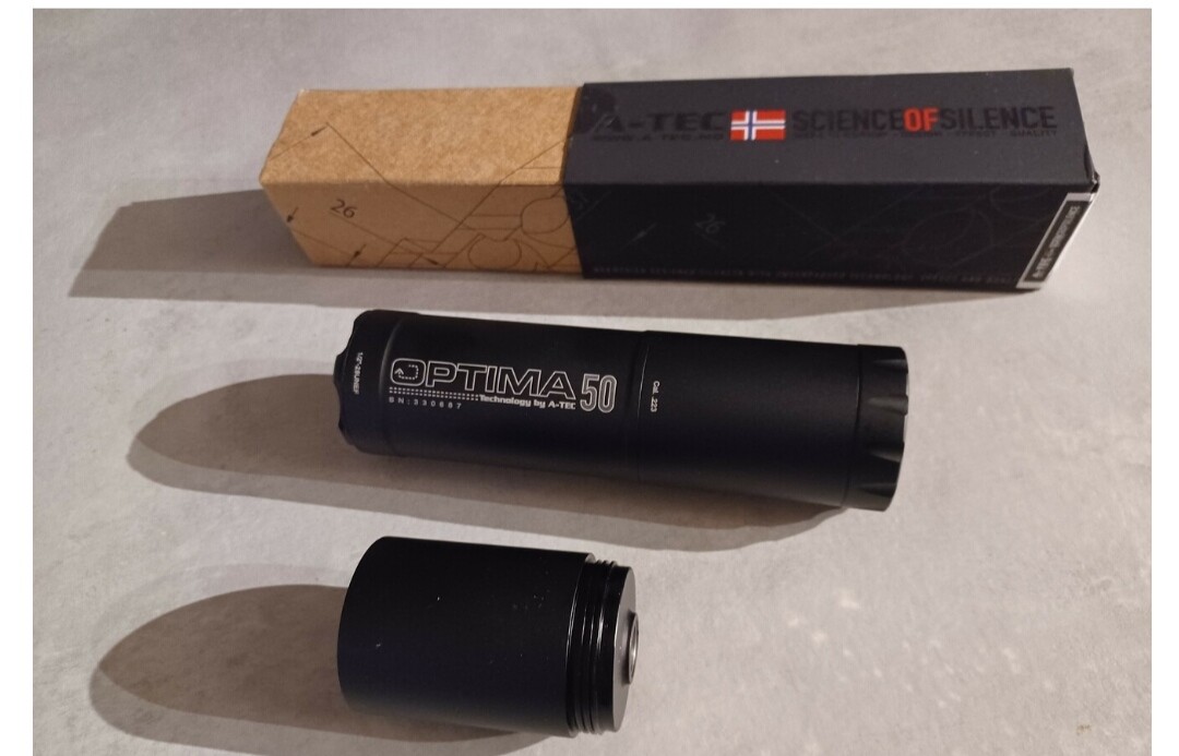 Säljer ljuddämpare med gänga 1/28. Stått i skåpet och används inte, mindre än 10 skott skjutna genom den.