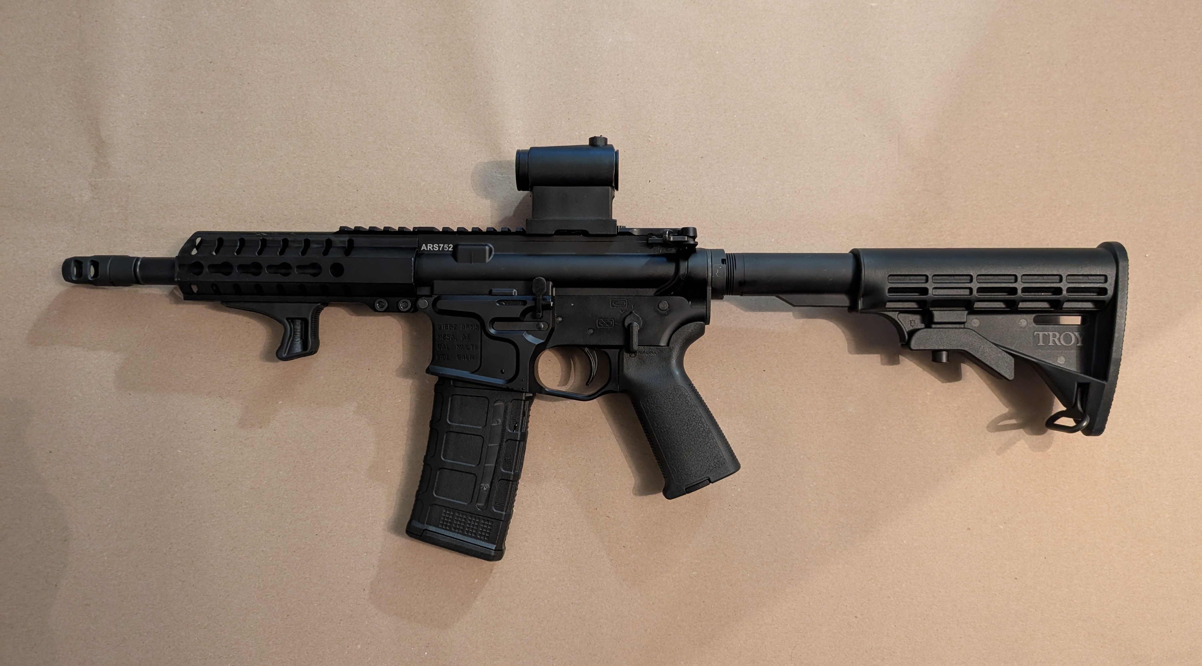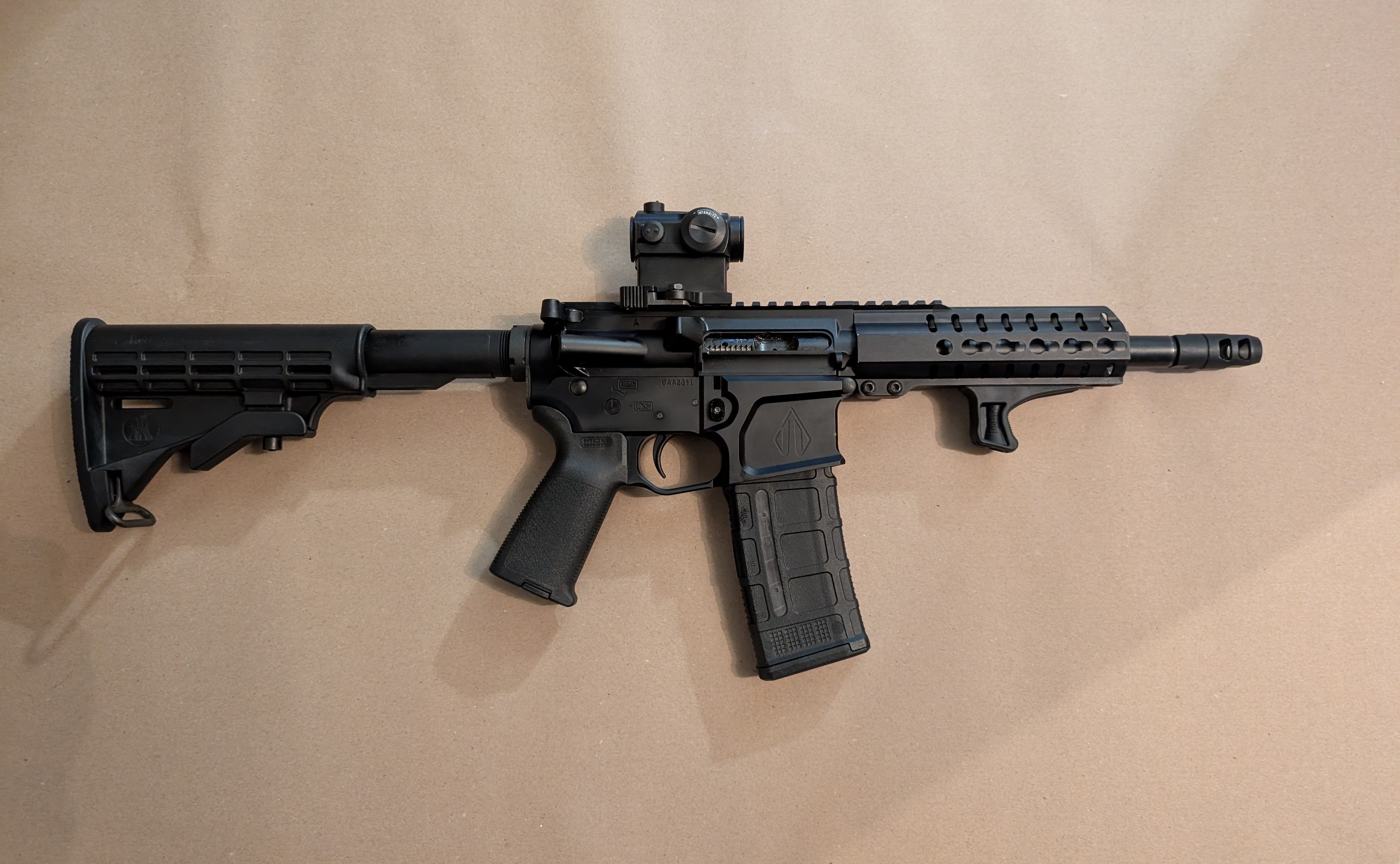 Custom byggd AR 15 i 9x19. Skjuter väldigt fint. Ingår 2 st Pmag 556 med 9mm insats, som fungerar lite sådär, händer att de inte matar fram om man laddar för många i maggen. Rekommenderar starkt CMMG magasin. Skjuten under 500 skott.