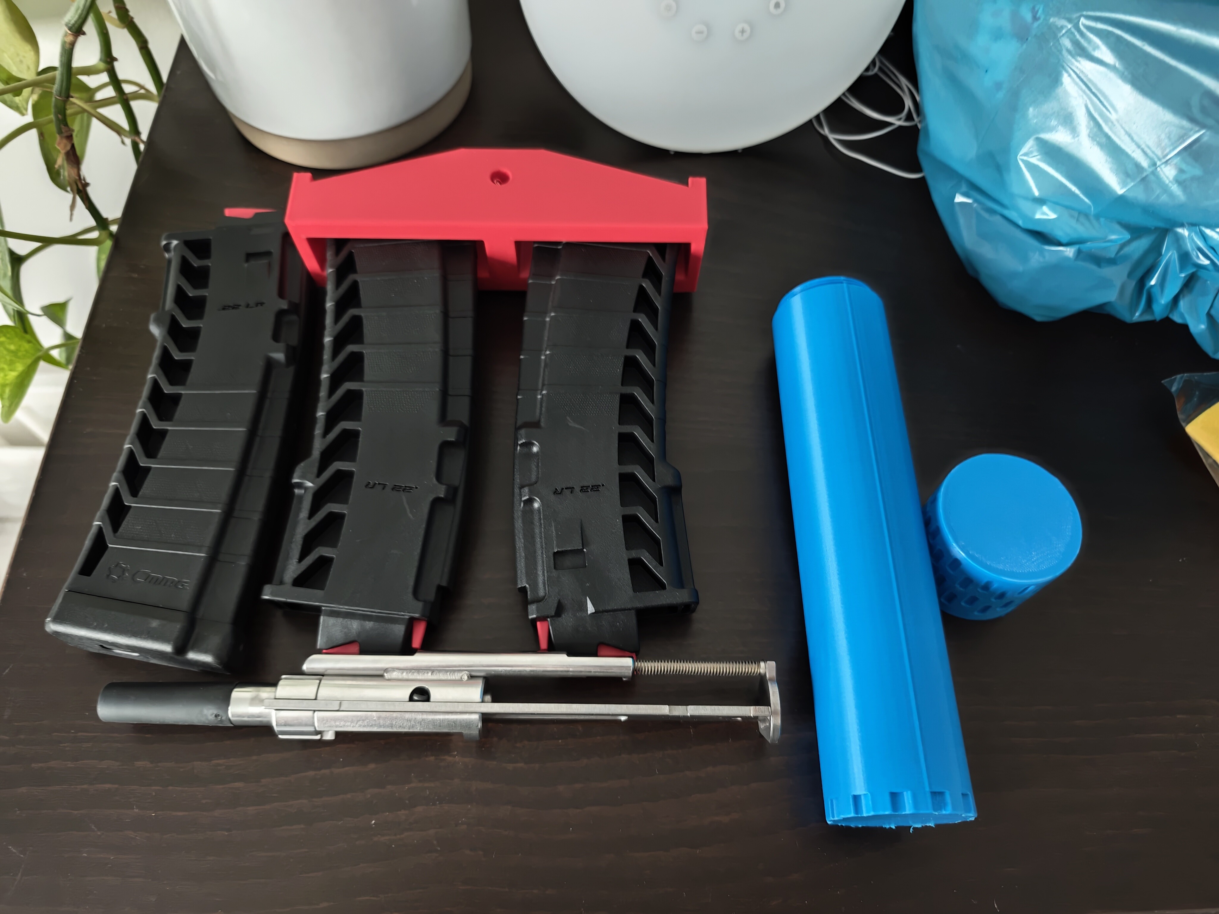 Kommer med själva enheten. 3 magasin. 3d printad magasin hållare med magneter samt förvaringstub