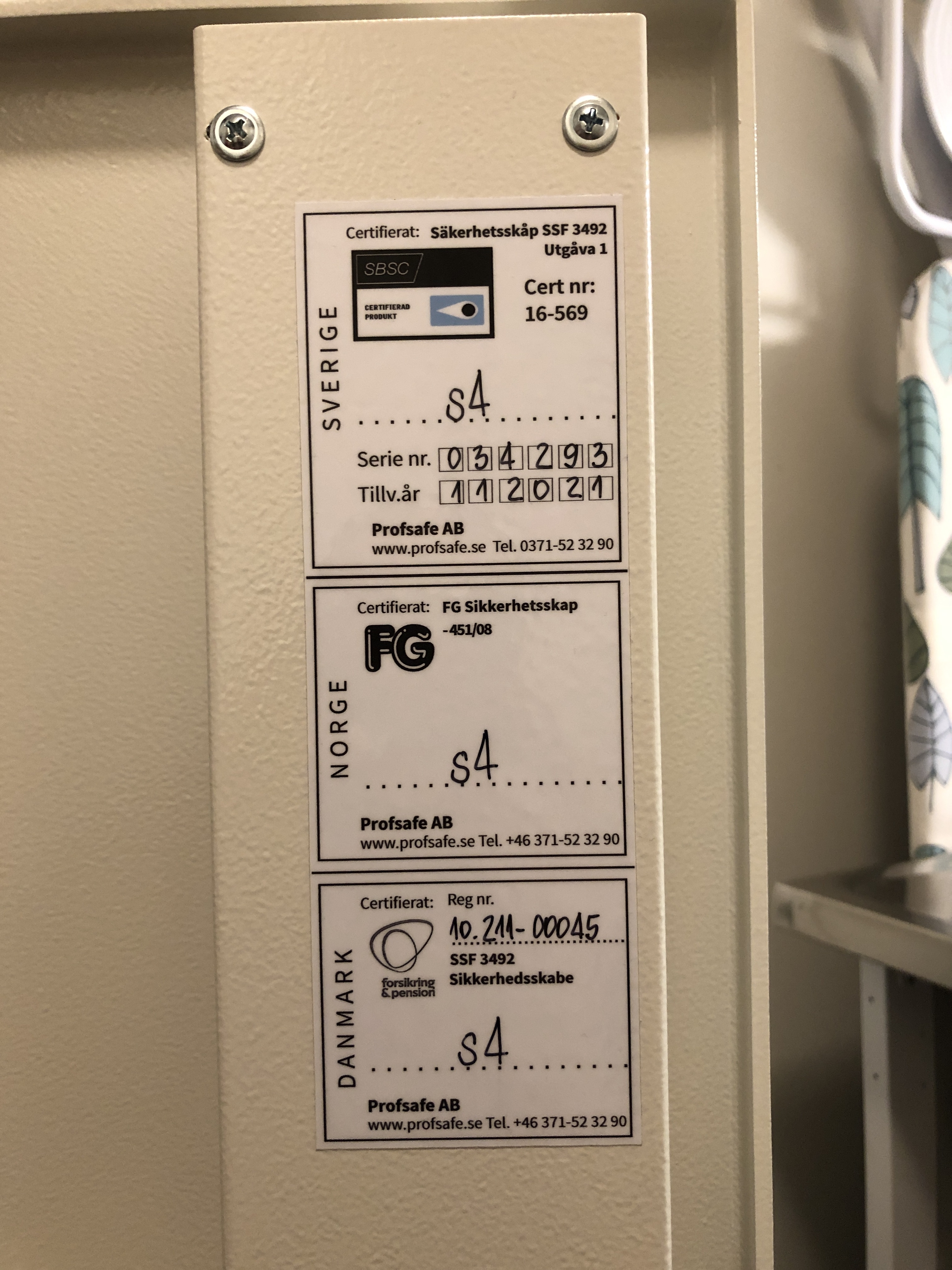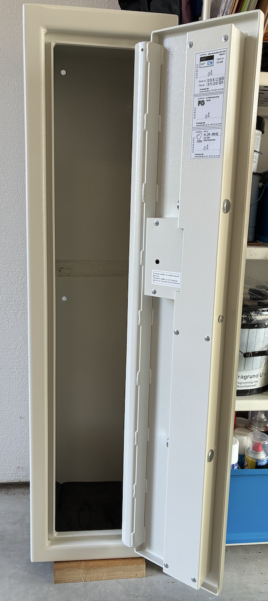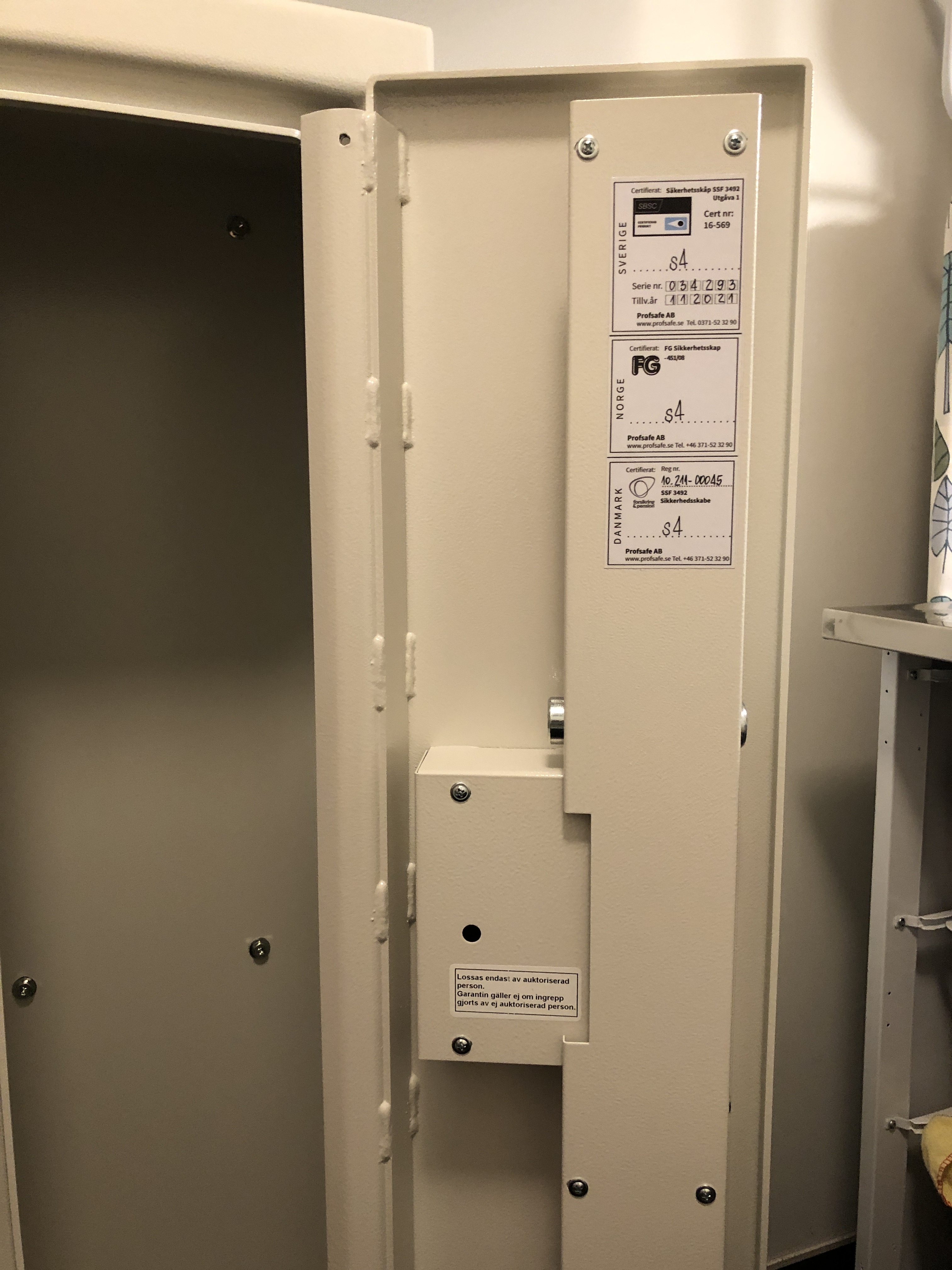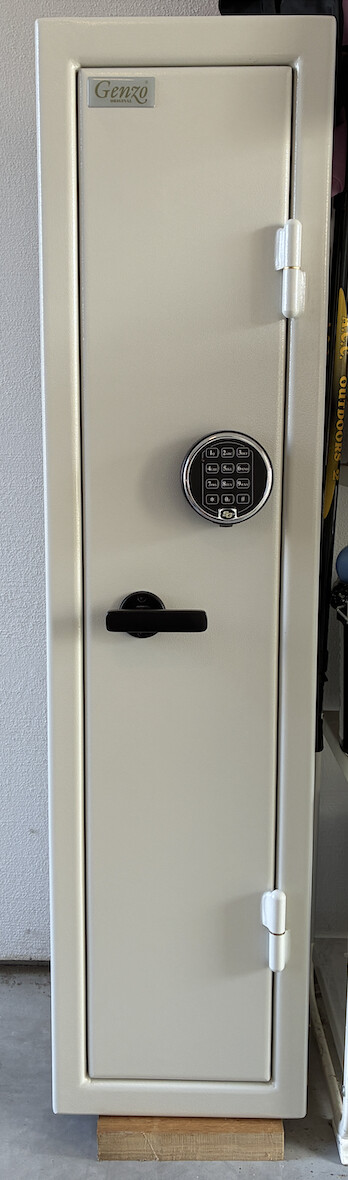 Beskrivning Vapenskåp Genzo Profsafe SS3492 med kodlås Köpt på 2022 SS3492 godkänt Mått: HxBxD: 1250 x 310 x 300 mm Vikt: 80 kg. Antal förankringshål : 4 st i botten och 4 st i bakre väggen PRIS: 4’500kr (pris för nytt: 5’995kr i Hylte)