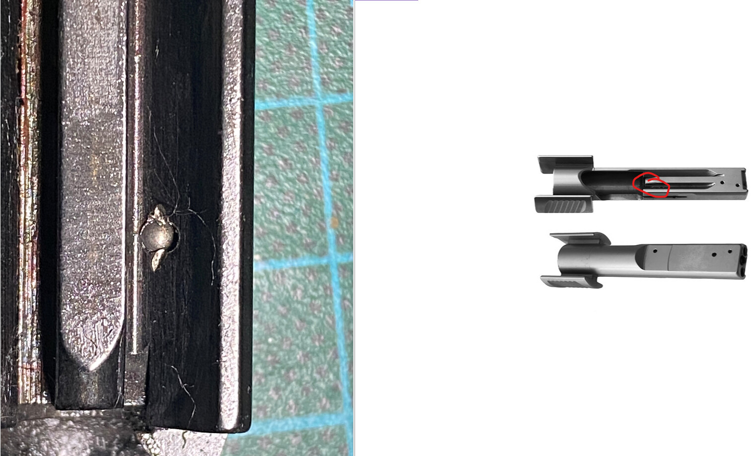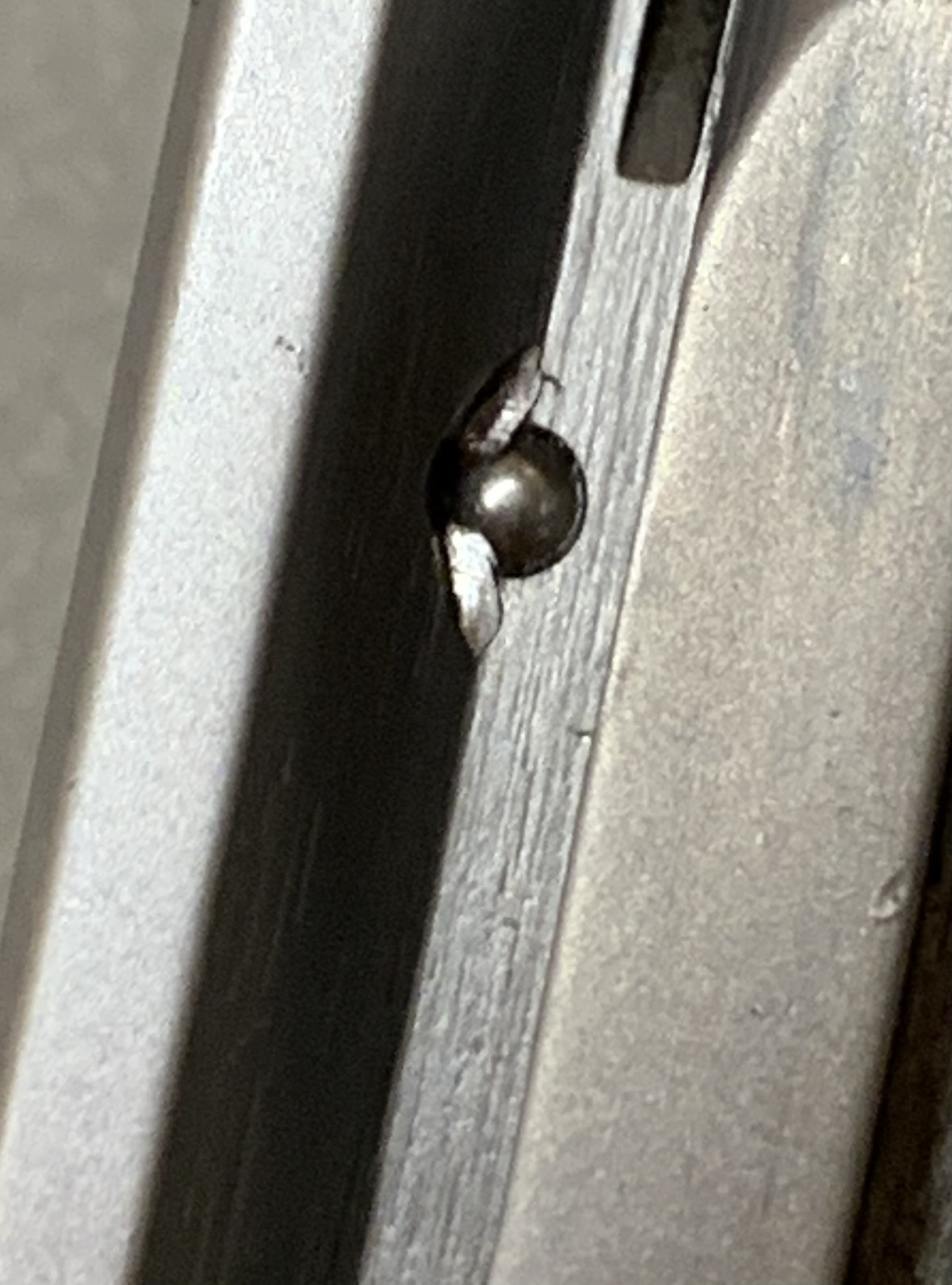 Rengjorde min Pardini SP HT och såg då nåt som ser ut som en kula nersänkt i fåran på undersidan av sluttycket - se bild - på sidan av den lilla “kula” så ser det ut som metallen är skadan, eller iaf har en ful grad/kant. Nån som vet vad det är? ska det vara så?