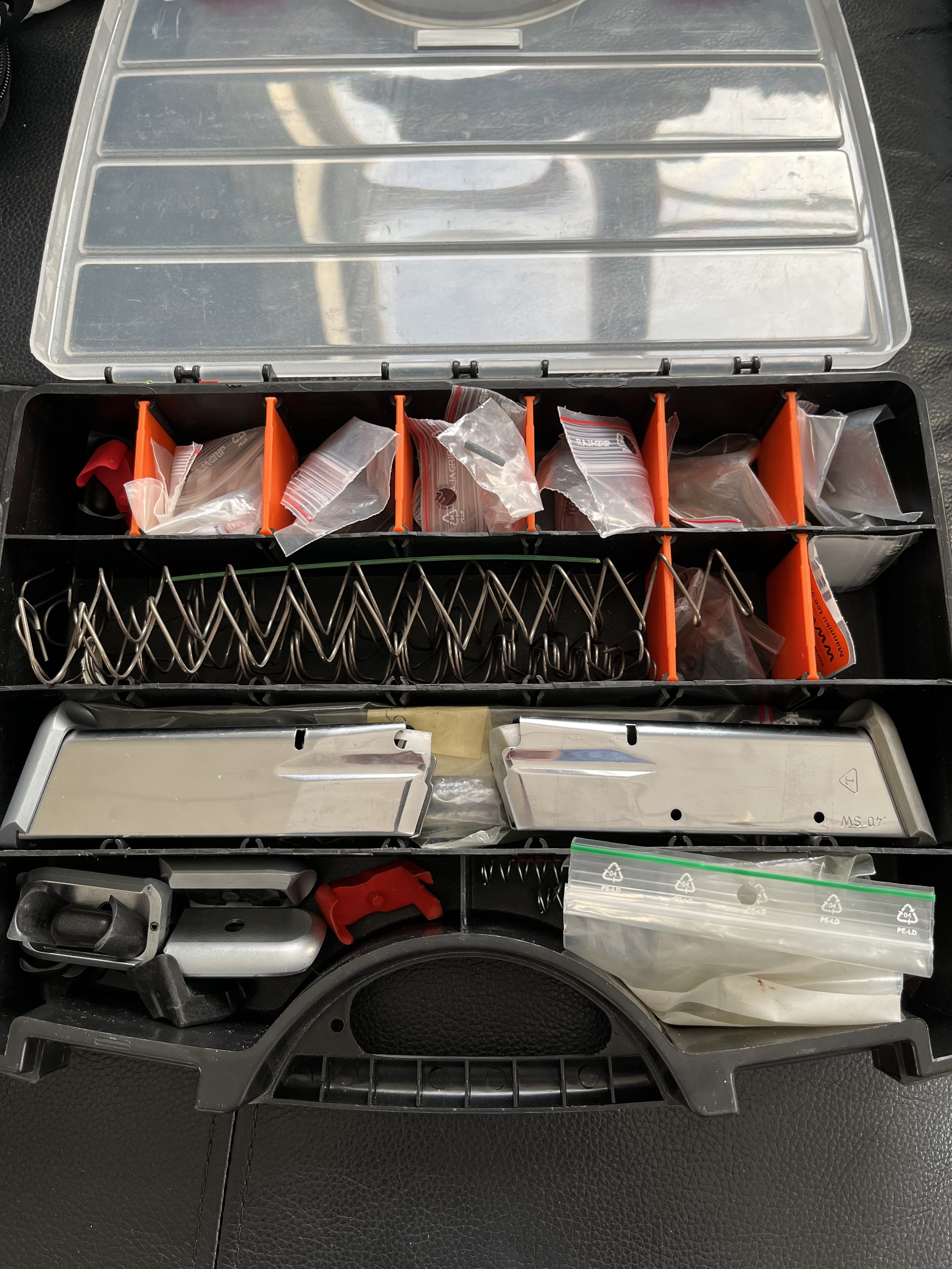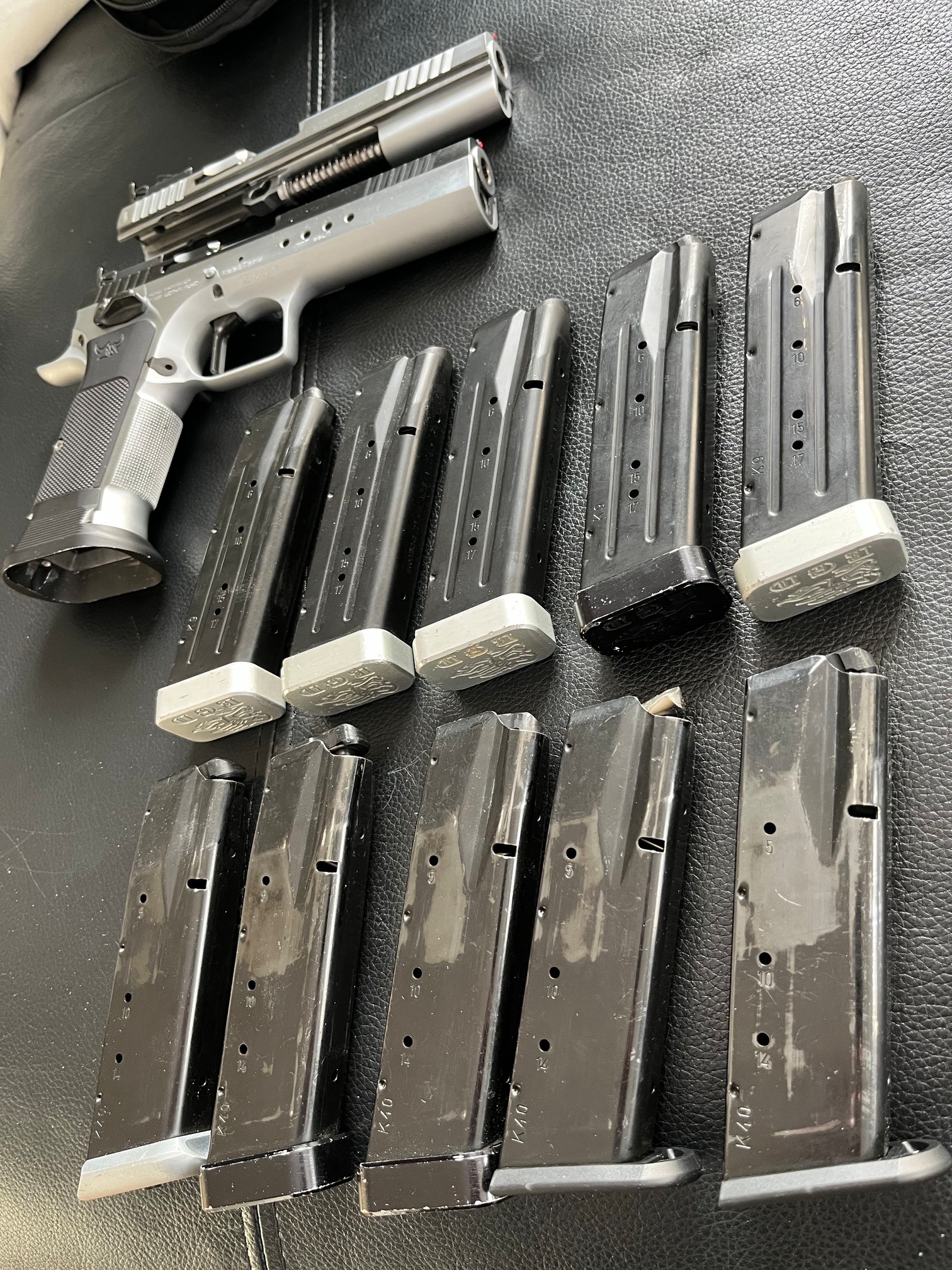 Ingår fem 9mm mag med graufel extension som jag tror rymmer 20-21 skott. Sju .40 magasin. En drös reservdelar i plastlåda. Originalbrunn finns och på pistolen sitter Henning brunn och grepp.