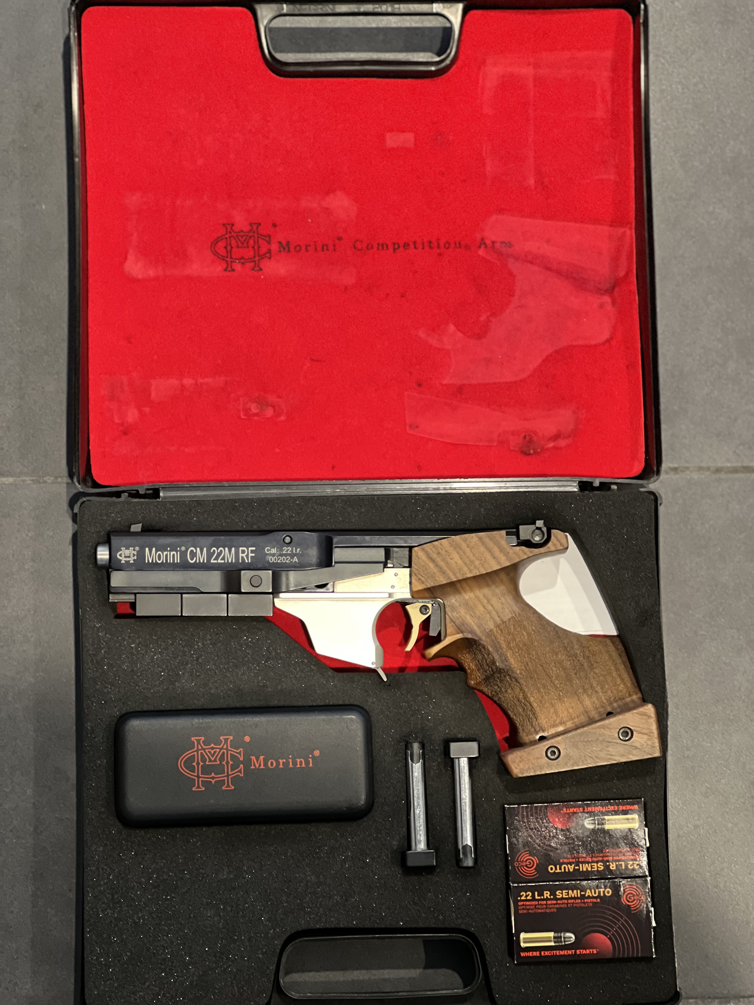 Schweizisktillverkad Morini CM 22M tävlingspistol i mycket gott skick. Vapnet är sparsamt använt (ca 4 000 skott) och inköpt nytt 2020.