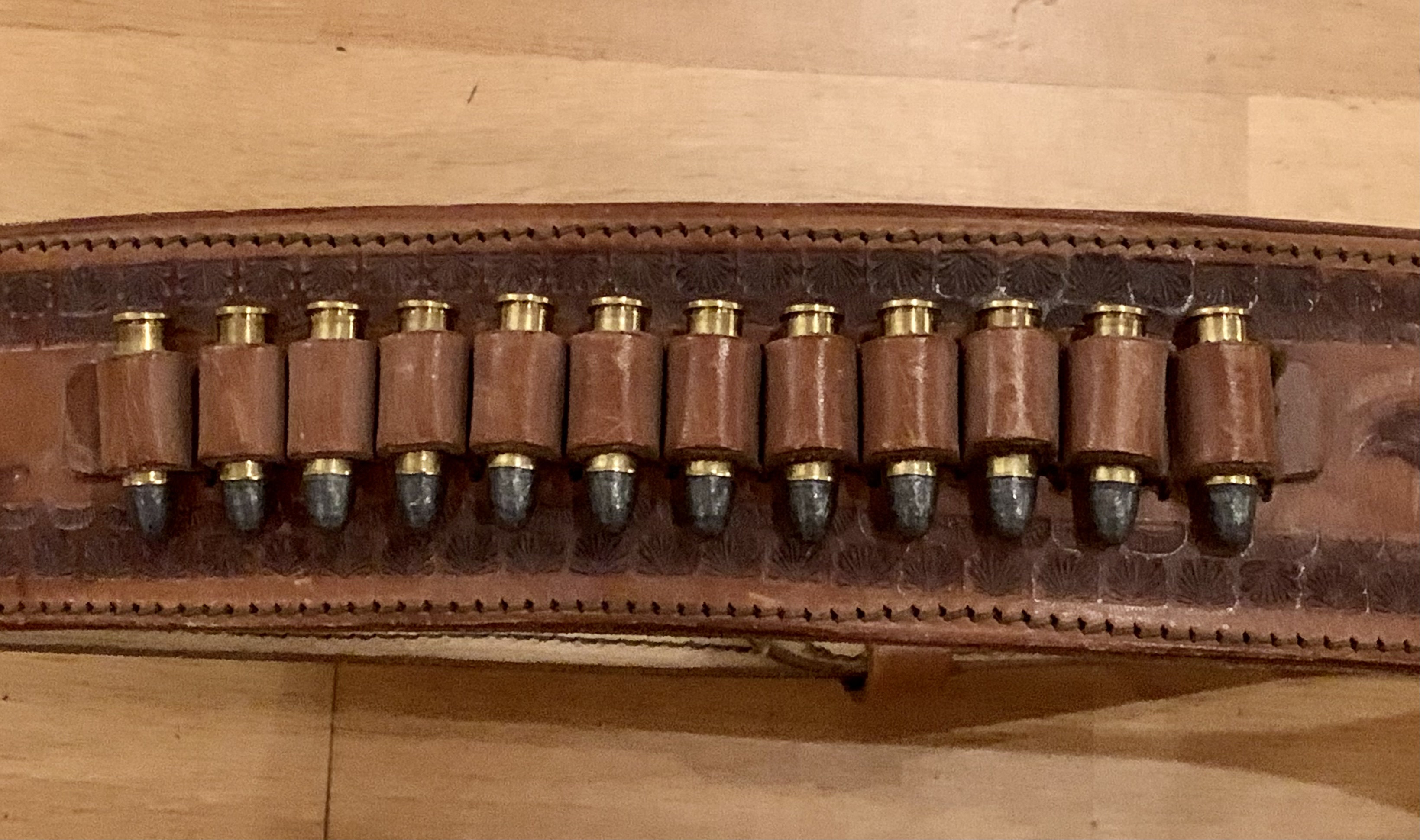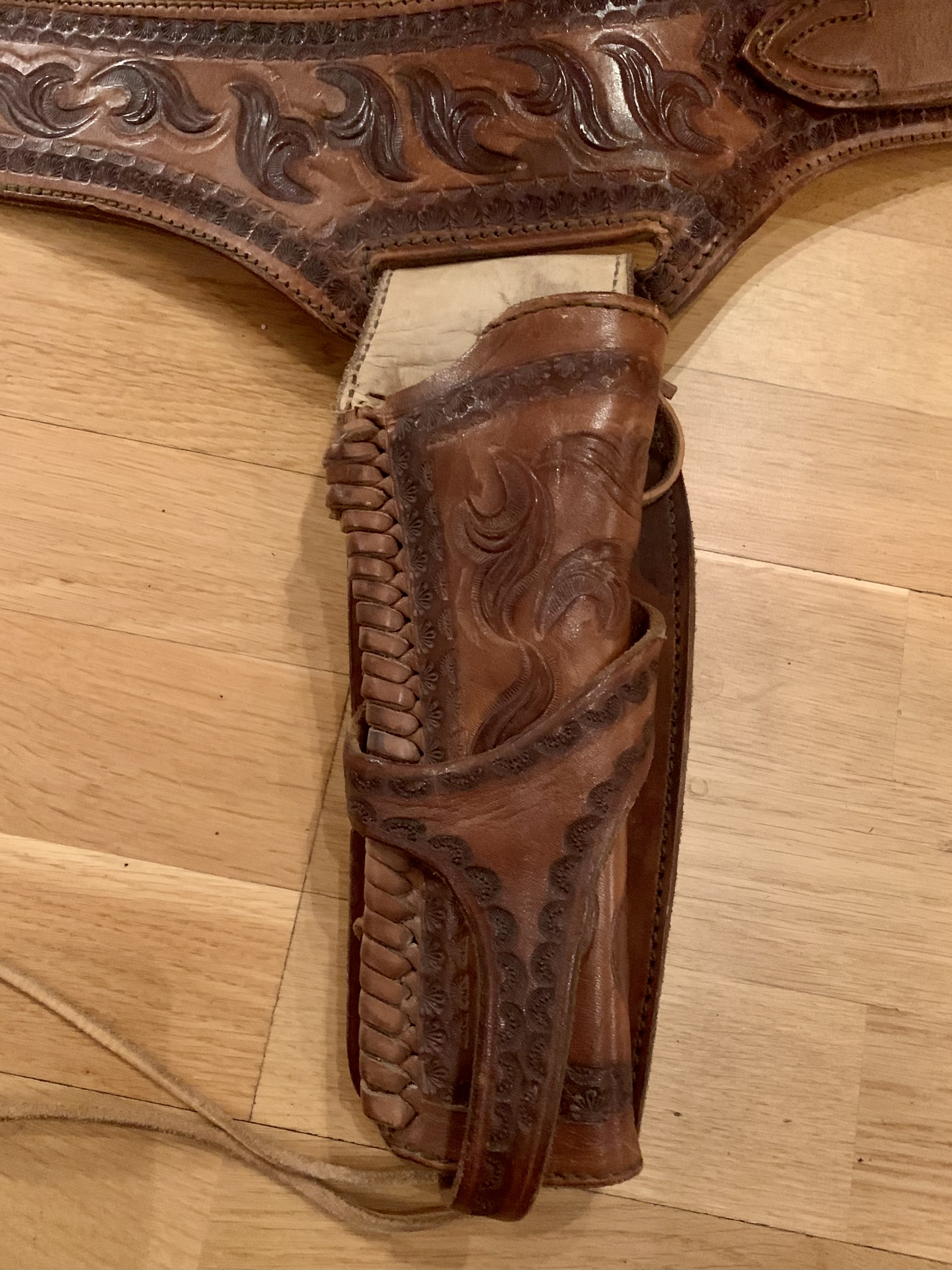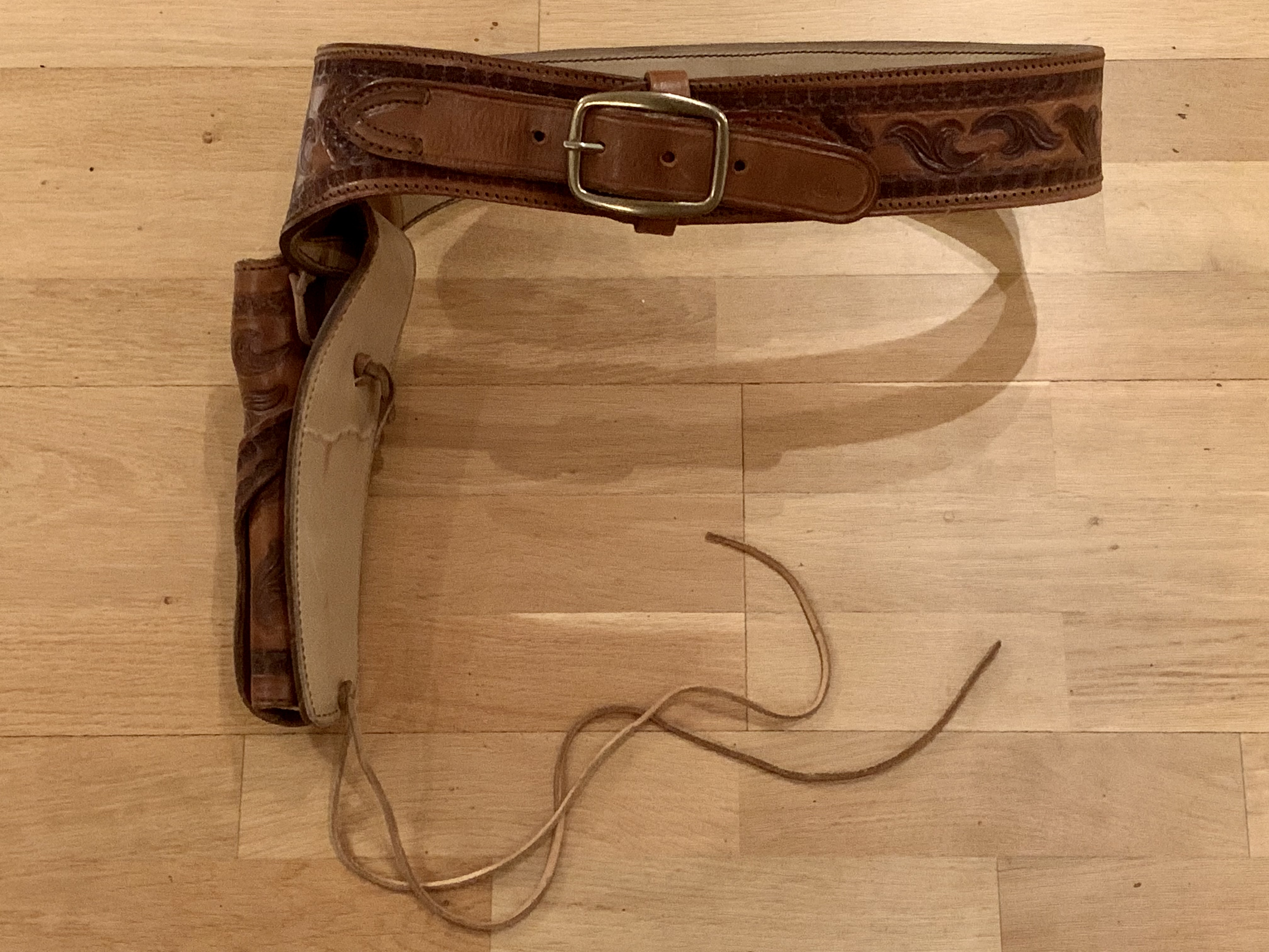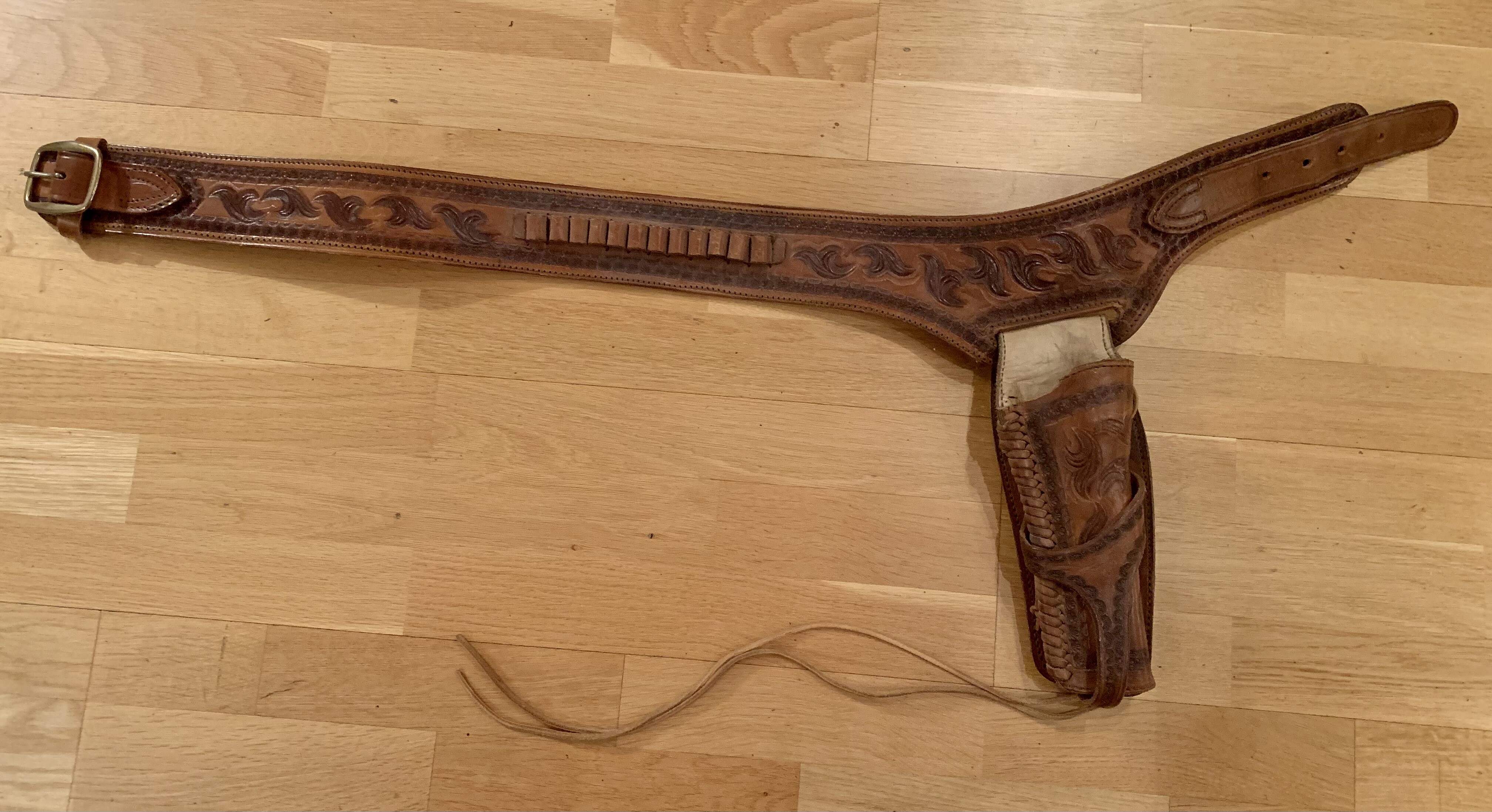 Handgjort västernhölster i kraftigt läder med snygga dekorationer och benrem. Passar de klassiska revolvrarna. Hållare för 12 st patroner (.38 på bilden, patroner medföljer ej).