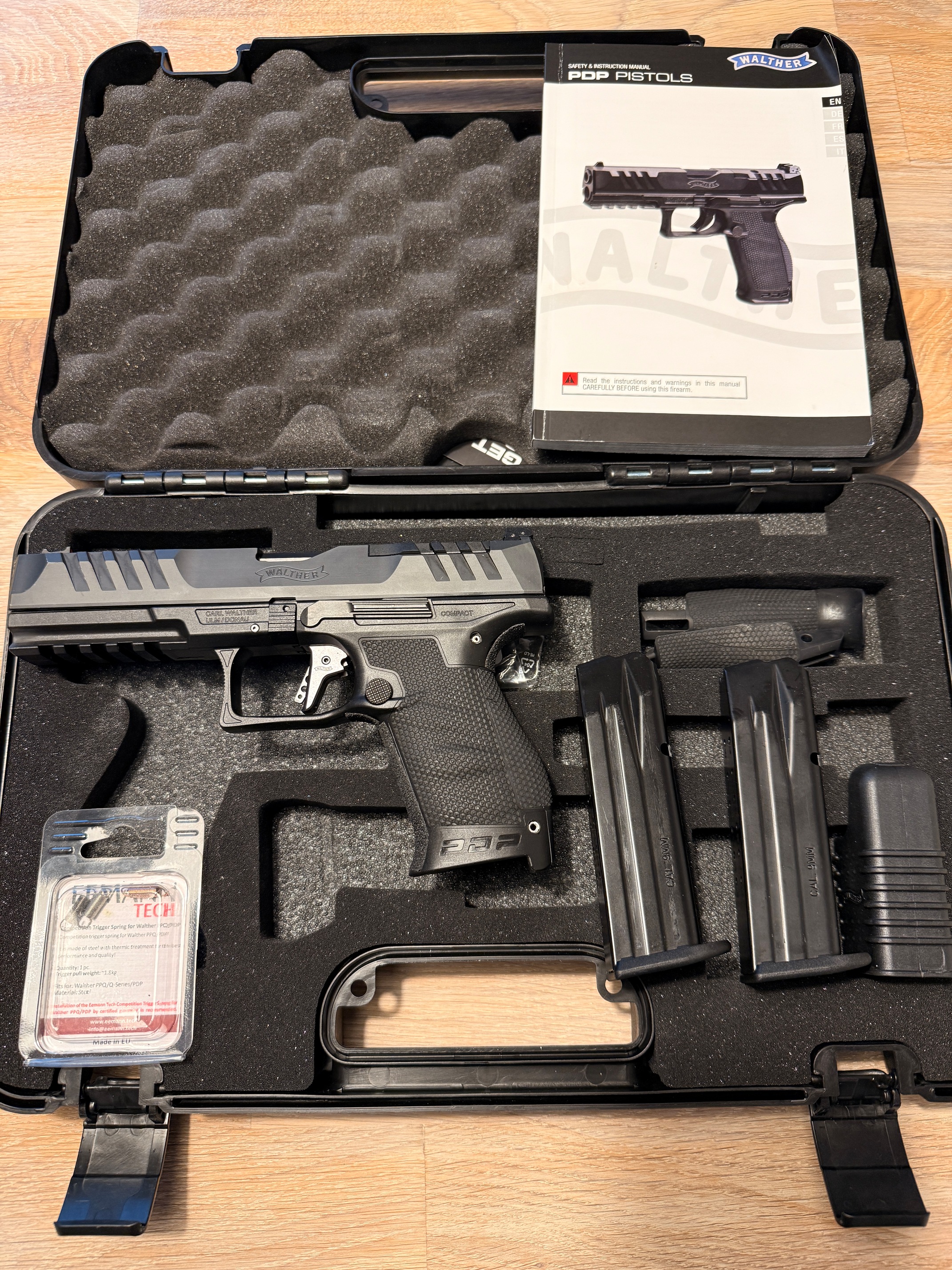 Pistolen köpt hos Karlolsson Jan 2024 och de monterade DPT i år samt bytte till en Eemann Tech Competition Trigger Spring (Walther PPQ/PDP Competition Trigger Spring | Eemann.Tech). All original tillbehör följer med enl. bild.