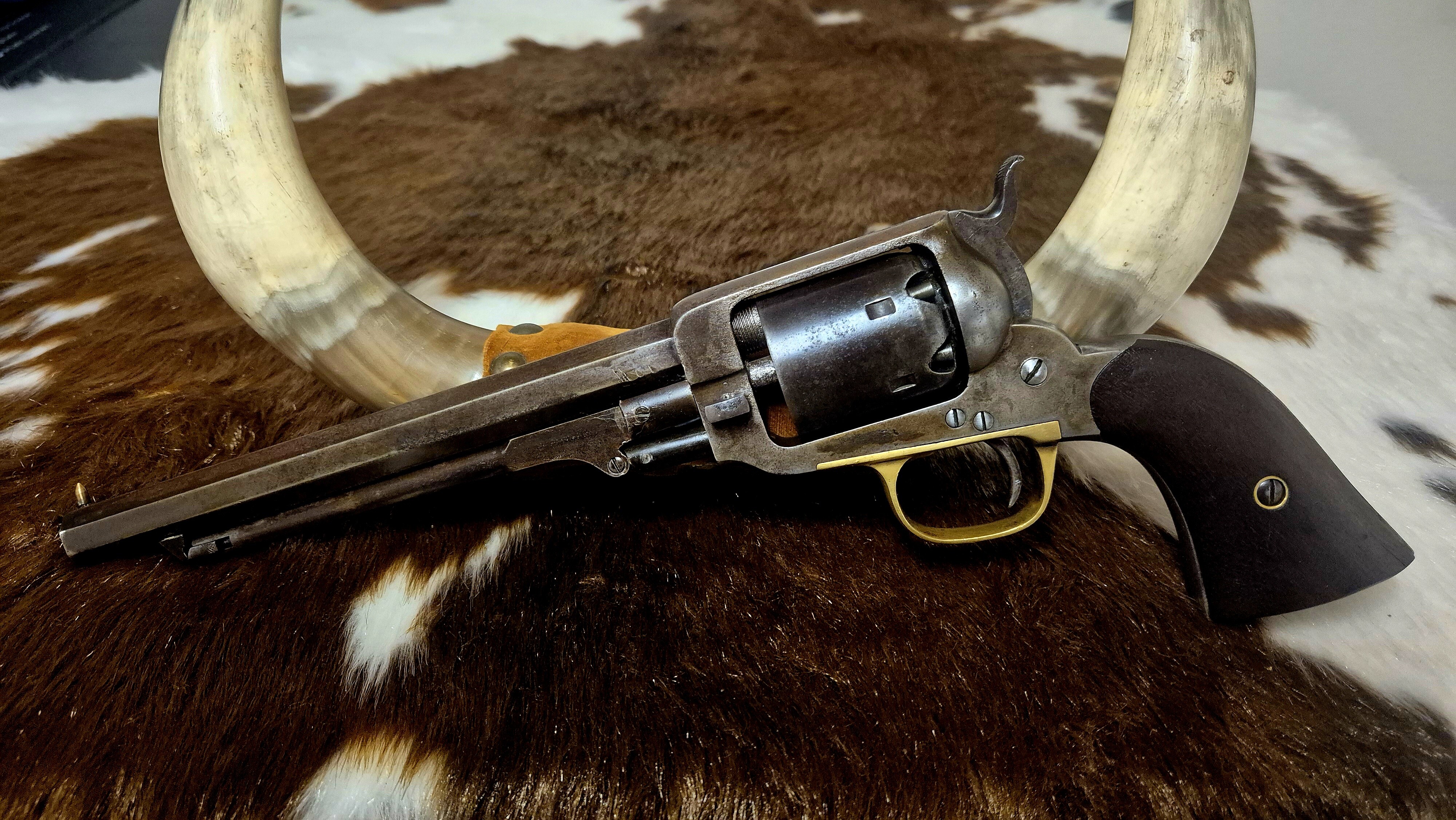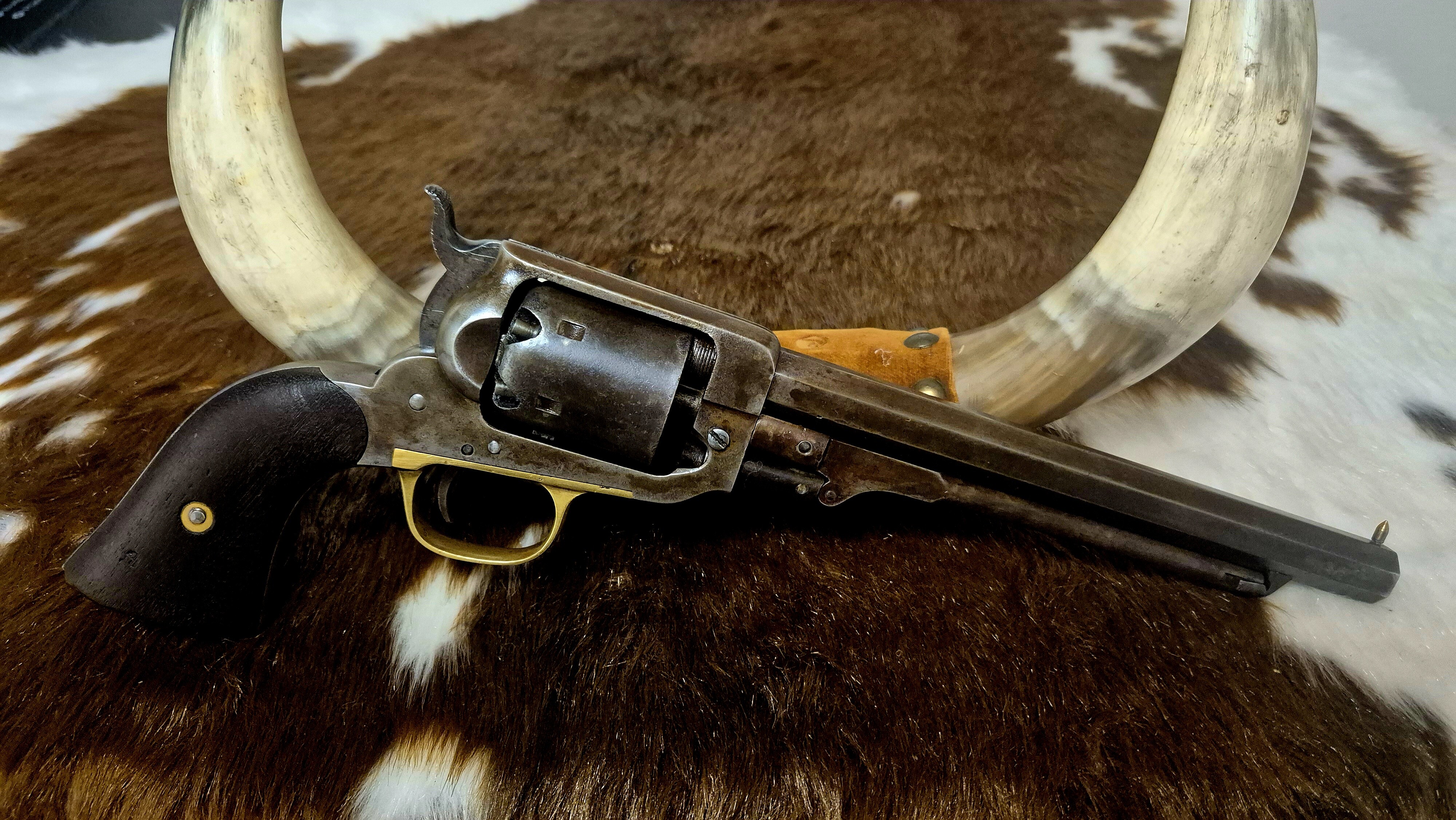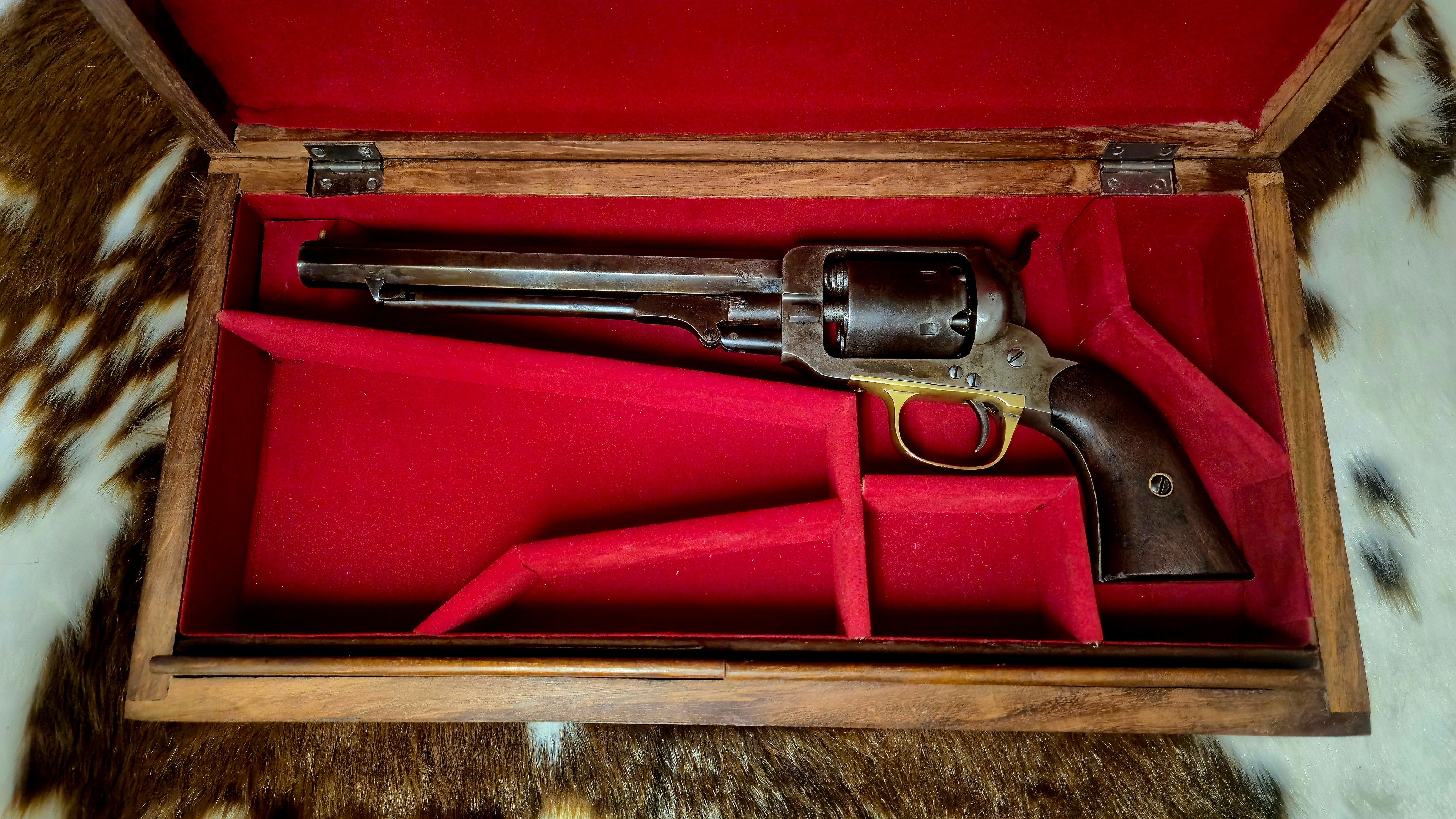 Whitney Navy i riktigt fint skick. Tillverkad 1860 talet. Single action, trumma för 6 skott. Finns lite blånering kvar, men det mesta har övergått till brun patina. Mekaniskt sett är revolvern i mycket bra skick. Bra spänst i alla fjädrar. Trycket är riktigt fint om man vill använda den till skytte. Med rätt skytt kommer denna revolver prestera riktigt bra på banan. Kornet är höjt för att passa skytte på 25 meter. Spel mellan trumma och pipa är 0.20mm. Revolvern är provskjuten utan några problem. Passar lika bra i samling som till skytte. Bara att ställa frågor. Har fler bilder om så önskas. I priset ingår schatull (repro)